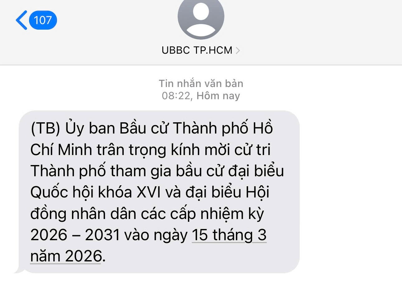 Tin nhắn có nội dung: Ủy ban bầu cử TP.HCM trân trọng kính mời cử tri TP tham gia bầu cử đại biểu Quốc hội khóa XVI và đại biểu HĐND các cấp nhiệm kỳ 2026 – 2031 vào ngày 15-3.