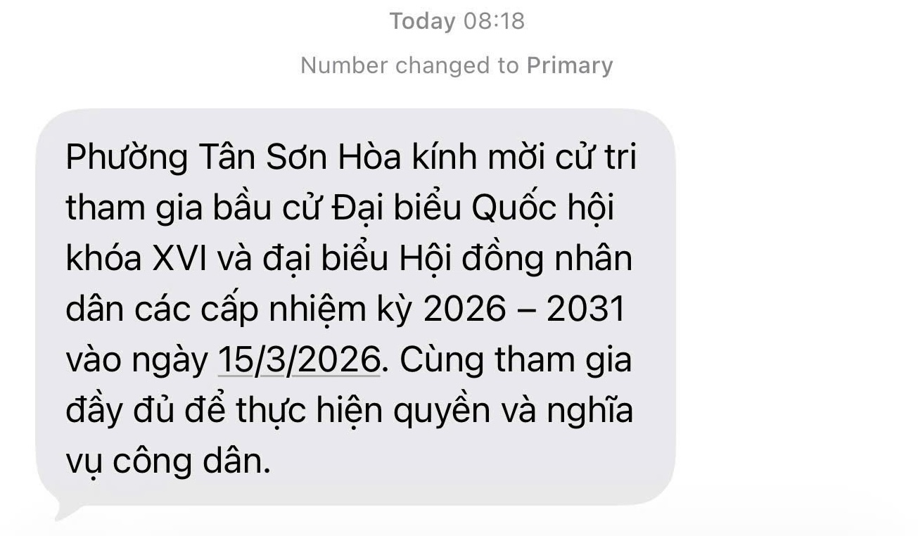 Cùng ngày, riêng người dân phường Tân Sơn Hòa, TP.HCM cũng nhận được tin nhắn tương tự khác: Phường Tân Sơn Hòa kính mời cử tri tham gia bầu cử đại biểu Quốc hội khóa XVI và đại biểu HĐND các cấp nhiệm kỳ 2026 - 2031 vào ngày 15-3-2026. Cùng tham gia đầy đủ để thực hiện quyền và nghĩa vụ công dân.