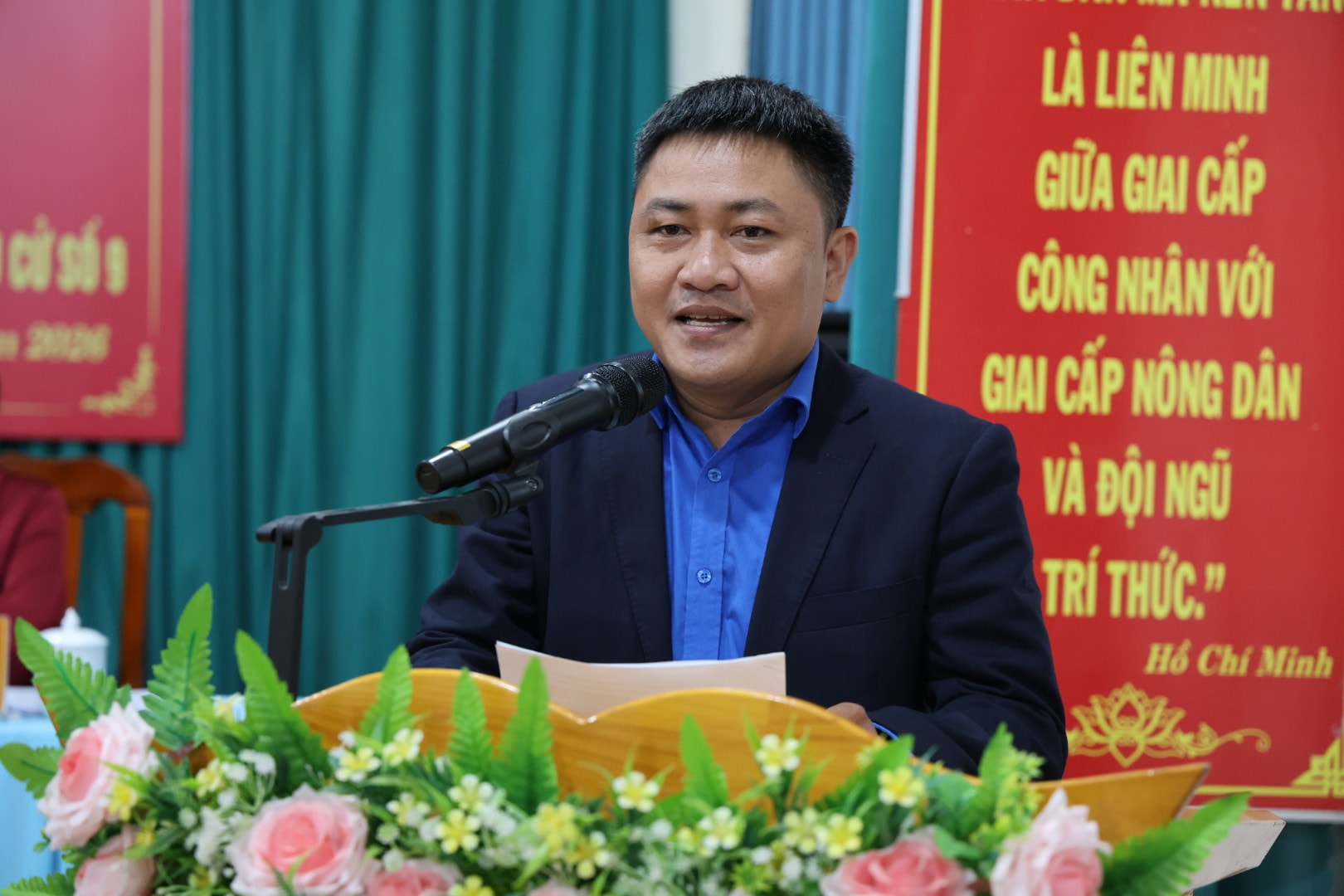 Ông Nguyễn Thanh Xuân, Giáo viên Trường THPT Phan Bội Châu, Ủy viên Ban Chấp hành Tỉnh đoàn Lâm Đồng, trình bày chương trình hành động trước cử tri