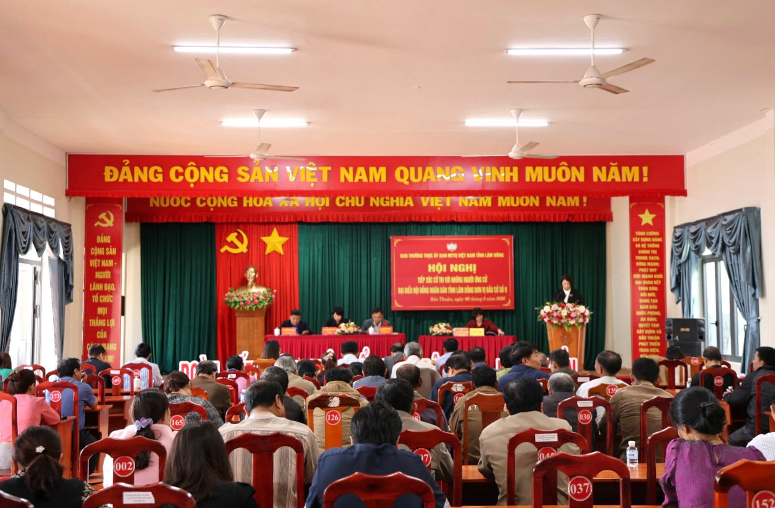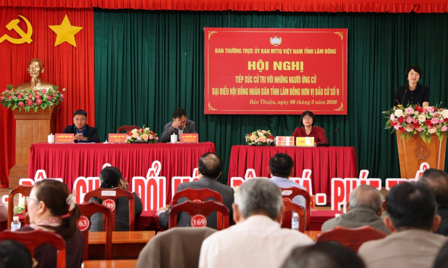 Bà Phạm Thị Phúc, Phó Bí thư Tỉnh ủy, Chủ tịch Ủy ban MTTQ Việt Nam tỉnh Lâm Đồng, trình bày chương trình hành động trước cử tri xã Bảo Thuận