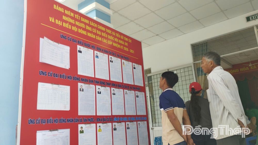 Cử tri ấp Tân Thuận, đơn vị bầu cử số 8 xem bảng niêm yết danh sách đại biểu trước khi thực hiện bầu cử