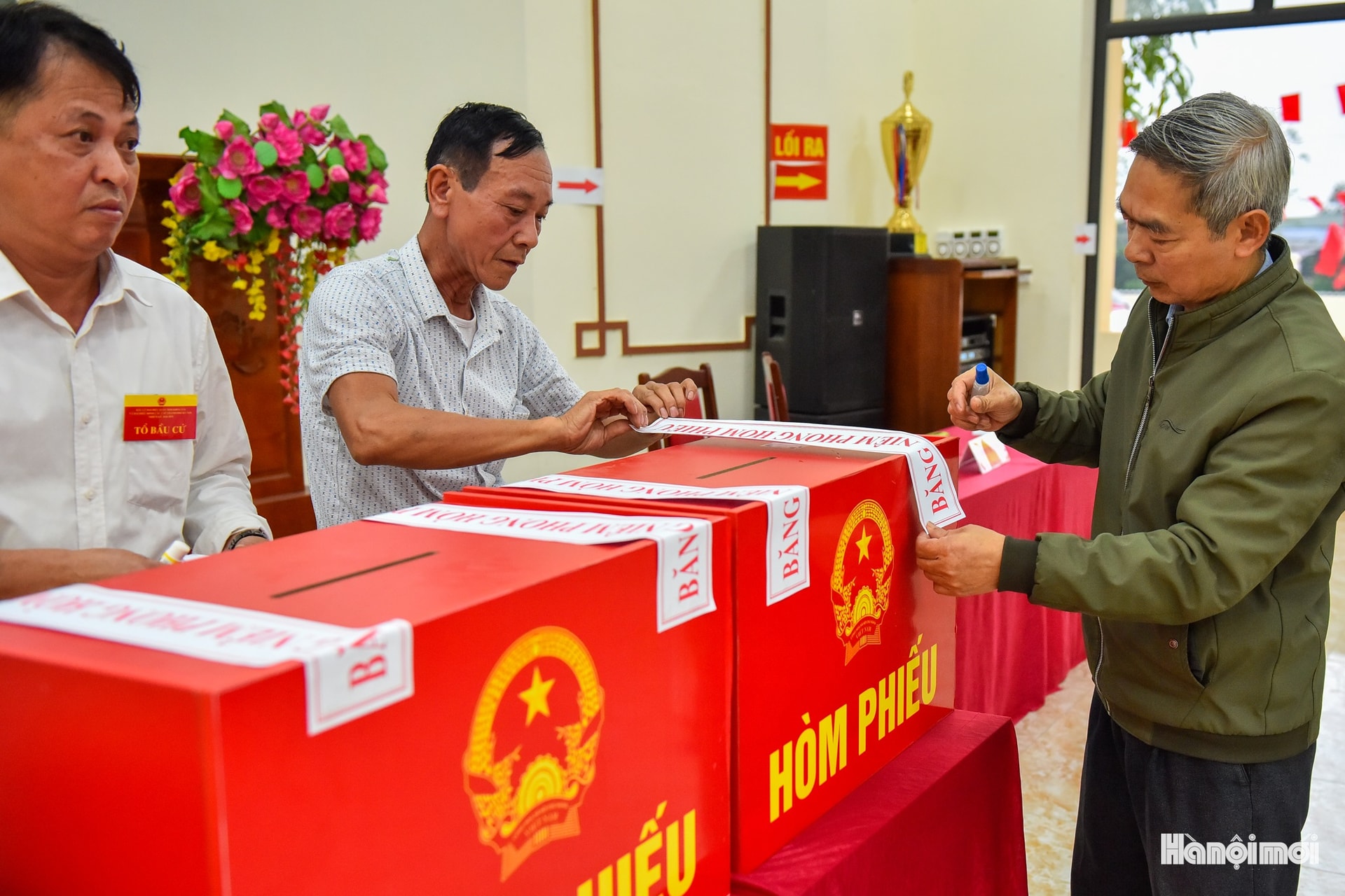 Thùng phiếu được niêm phong công khai trước sự chứng kiến của các thành viên tổ bầu cử và cử tri, đảm bảo đúng quy trình và quy định.