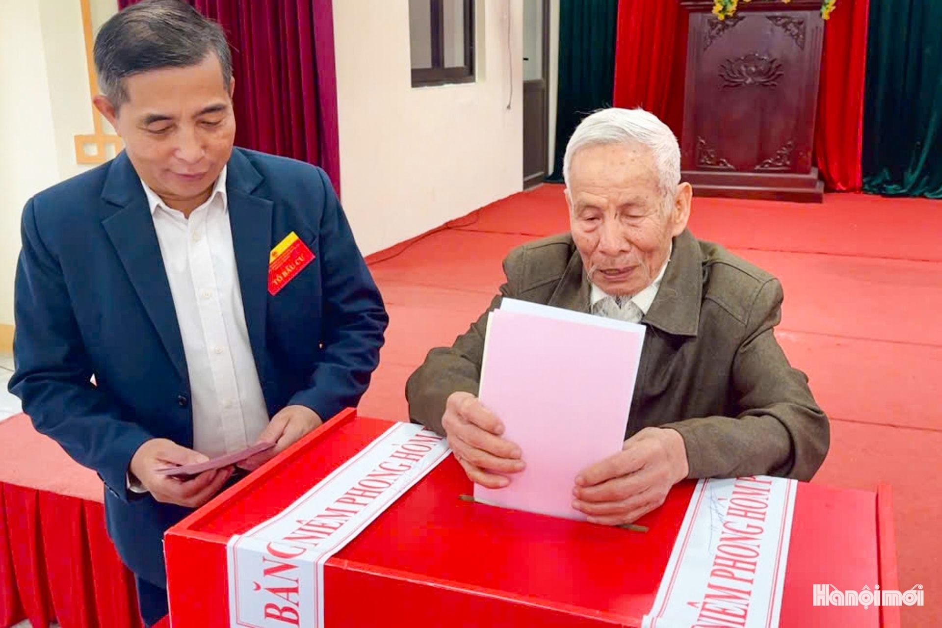 Cụ Phùng Như Tha, 95 tuổi đời, 72 năm tuổi Đảng, cử tri cao tuổi nhất xã Vật Lại tham gia bỏ phiếu trong ngày bầu cử.