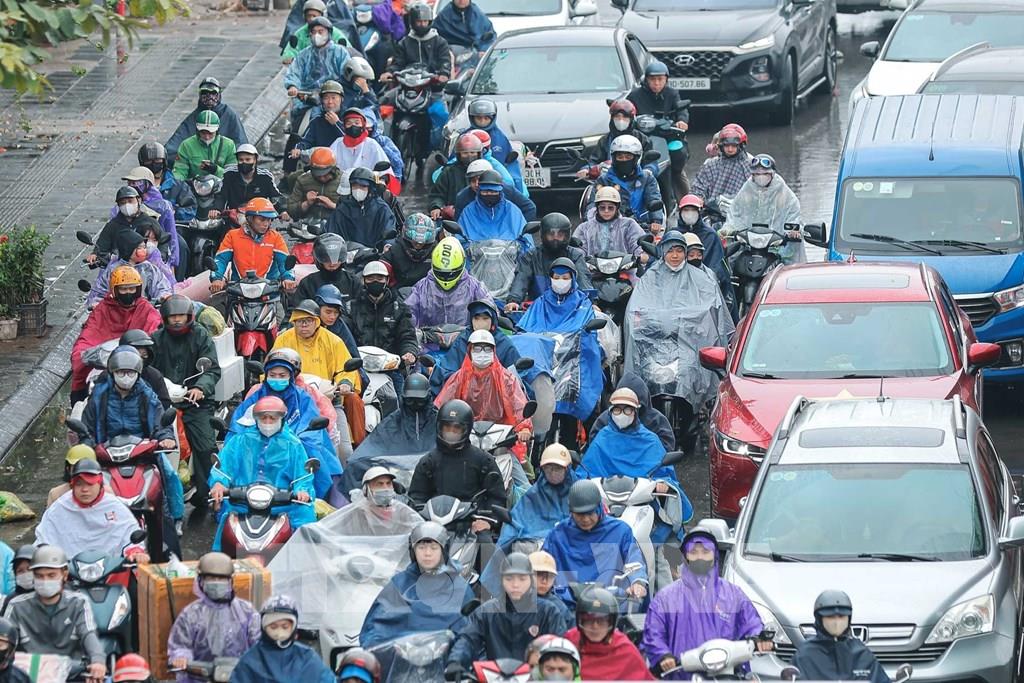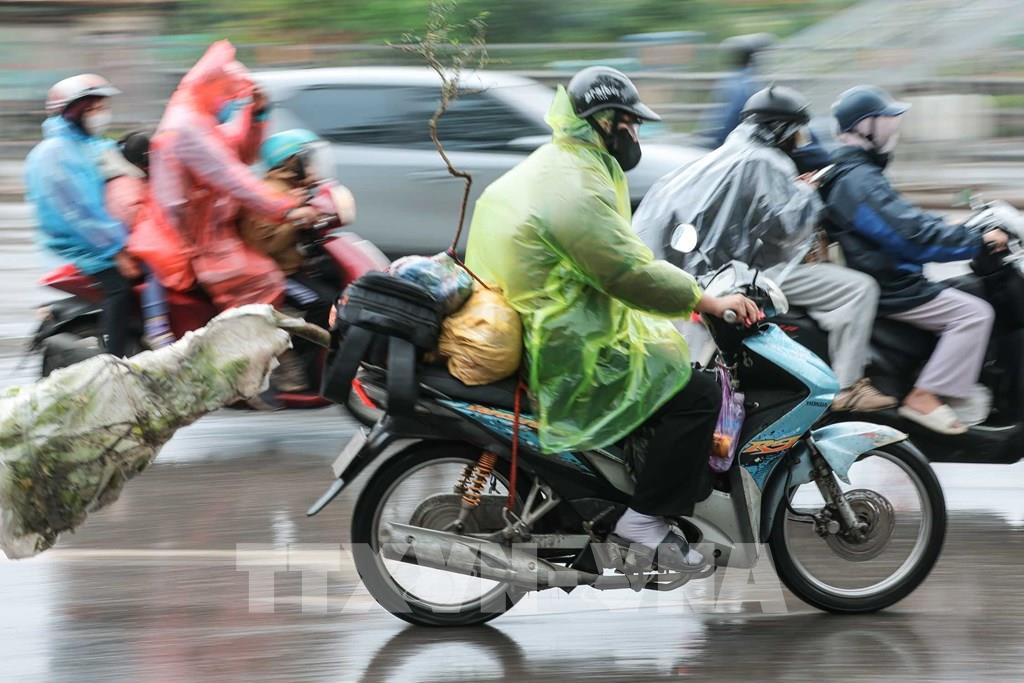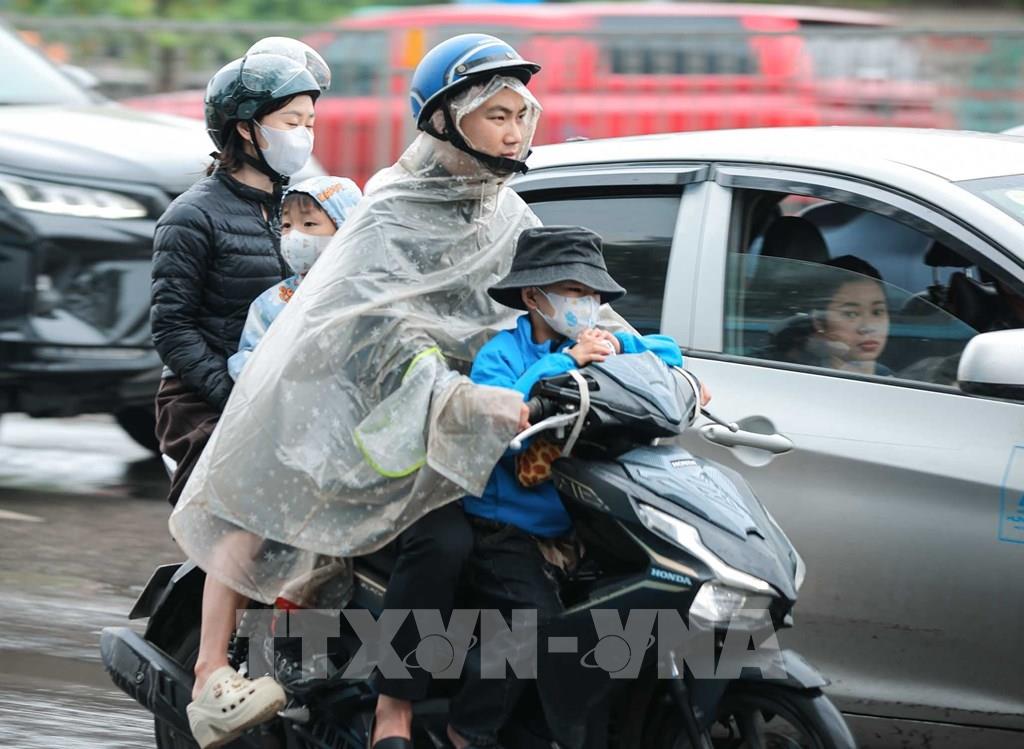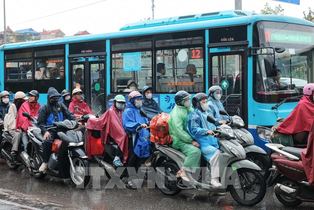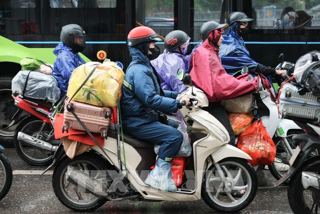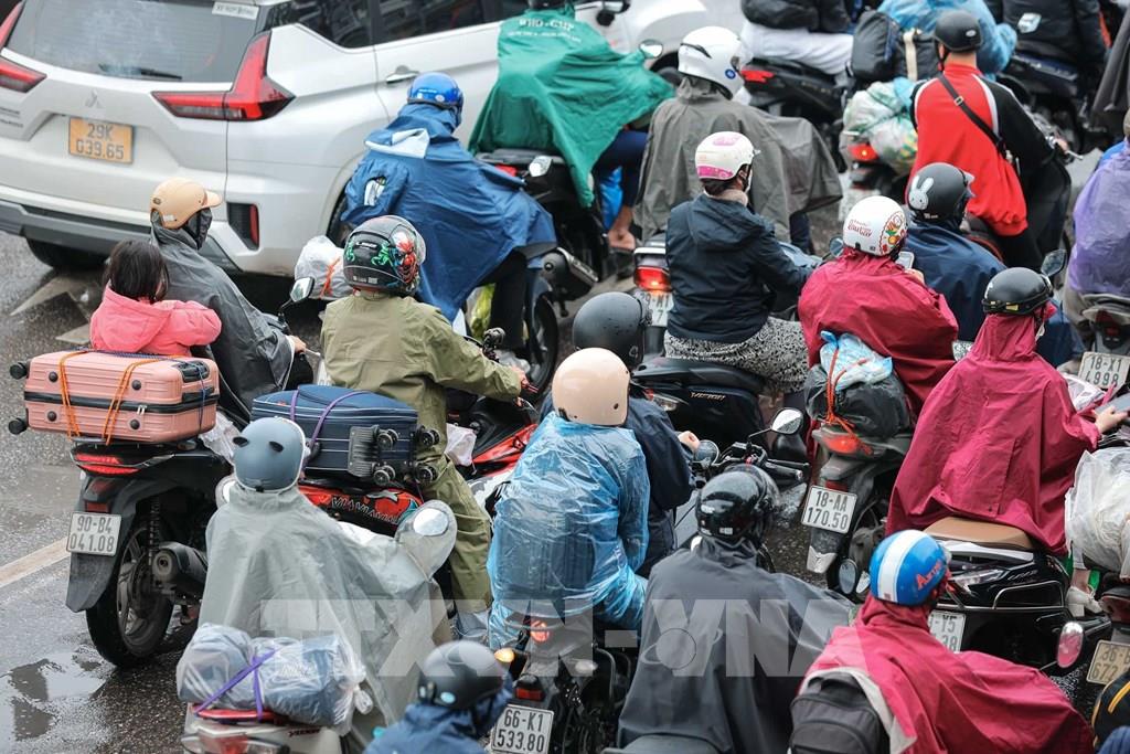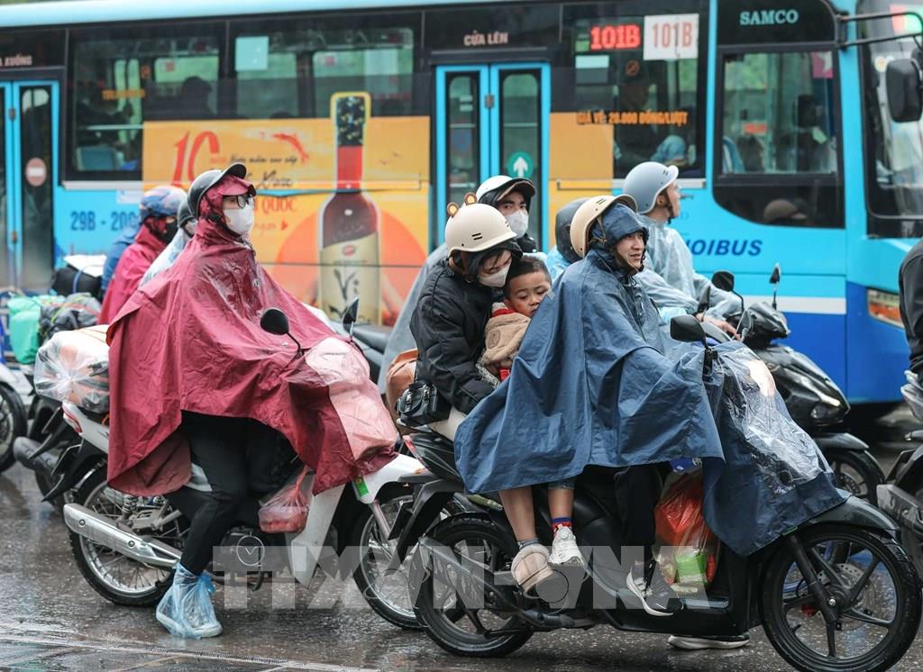 Dòng người dân đội mưa quay lại Hà Nội chuẩn bị cho tuần làm việc mới. Ảnh: Hoàng Hiếu - TTXVN