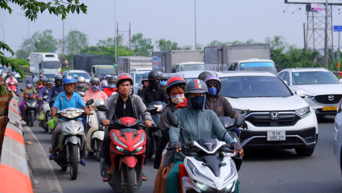 Từ sáng đến trưa, Quốc lộ 1 và đường dẫn cao tốc TP.HCM – Trung Lương luôn đông đúc, nhiều đoạn ùn ứ, ô tô di chuyển khó khăn. Càng về trưa, mật độ giao thông tăng cao, đặc biệt lượng xe máy tăng đột biến khi nhiều người chọn phương tiện cá nhân để về quê. Nhiều xe máy chở lỉnh kỉnh hành lý, len lỏi vào làn ô tô, khiến tình hình giao thông thêm phức tạp.