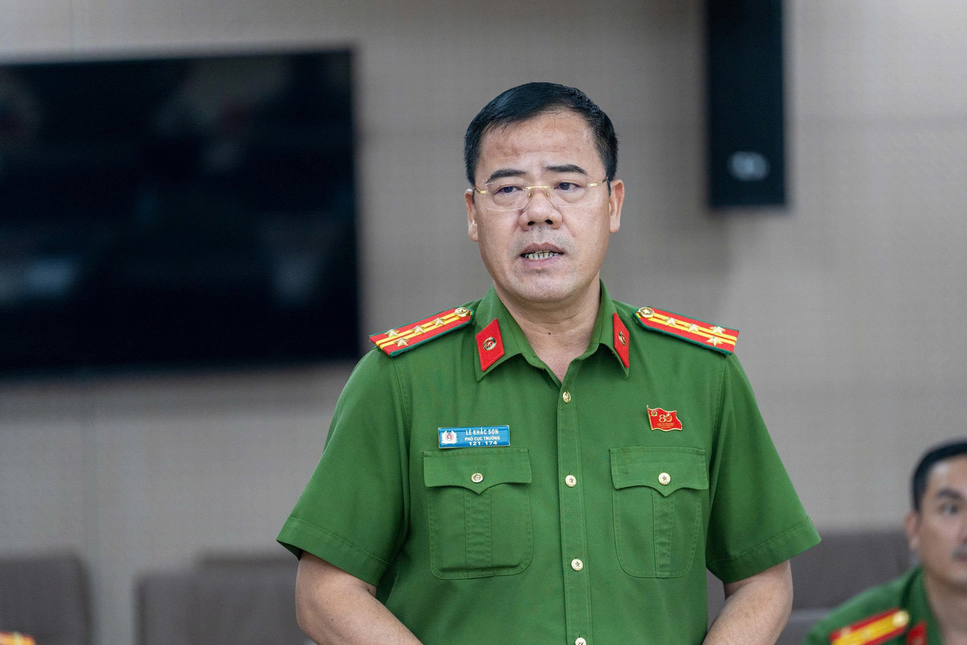 Đại tá Lê Khắc Sơn, Phó Cục trưởng Cục Cảnh sát hình sự (C02, Bộ Công an), thông tin tại cuộc họp báo. Ảnh: Phạm Nam.