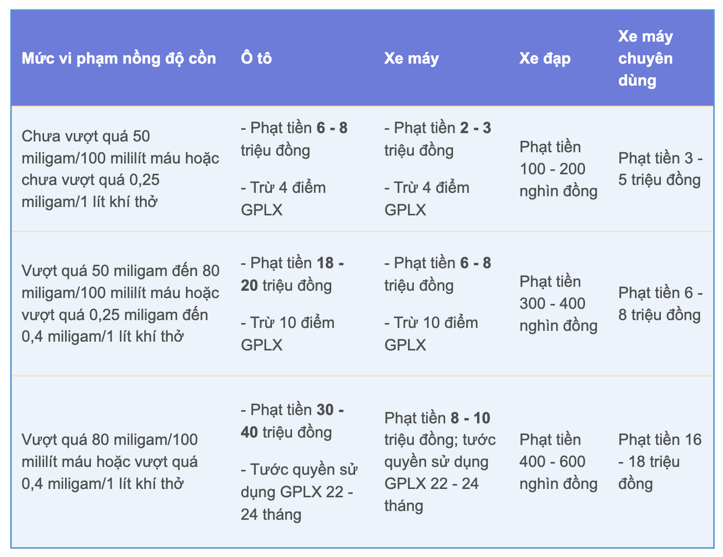 Mức phạt vi phạm nồng độ cồn như sau: