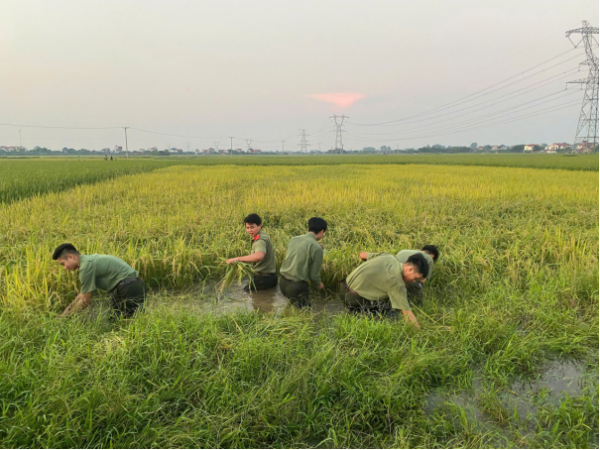 Học viên Trường Cao đẳng ANND I giúp bà con nhân dân thu hoạch lúa bị ngập úng do mưa lớn kéo dài.
