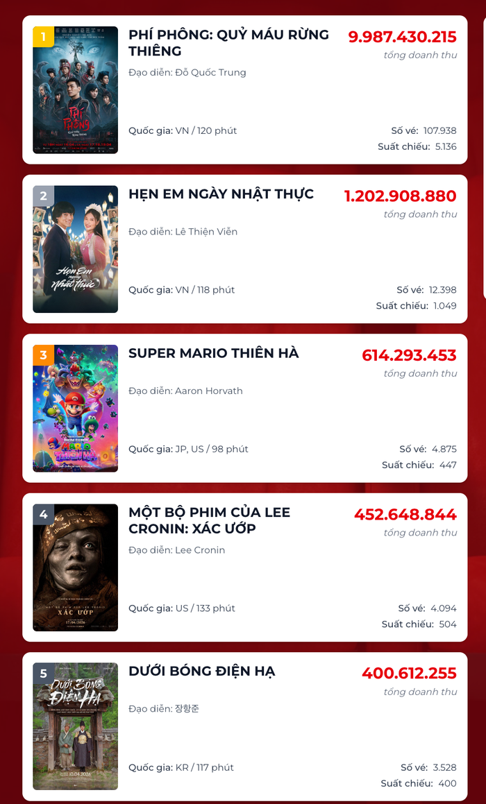 Đứng đầu bảng xếp hạng cục diện phòng vé ngày 19/4 không ai khác ngoài Phí Phông: Quỷ Máu Rừng Thiêng. Tác phẩm của đạo diễn Đỗ Quốc Trung đang tạo nên một cơn địa chấn thực sự khi bỏ xa các đối thủ còn lại.