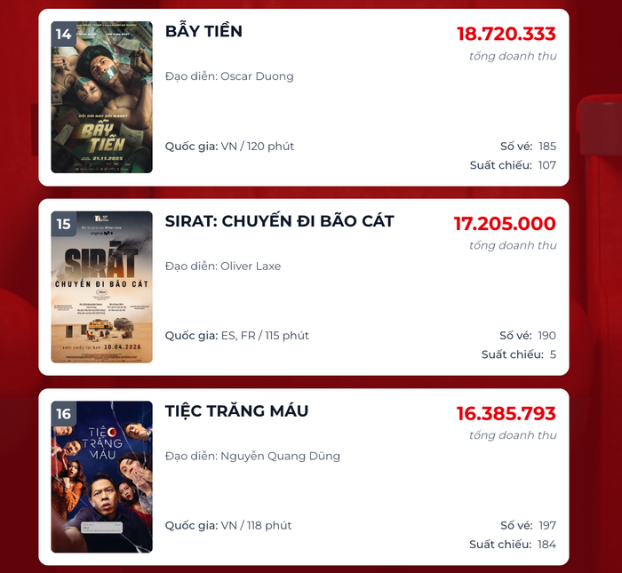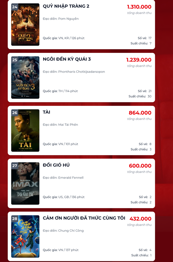 Ở chiều ngược lại, cục diện phòng vé ngày 19/4 cũng chứng kiến những ngày cuối trong hành trình ra rạp của một số cái tên quen thuộc. Phim tài liệu Tài của Mỹ Tâm và phần 2 của series Quỷ Nhập Tràng hiện đã lui về những vị trí cuối bảng với số suất chiếu khiêm tốn. Dù doanh thu không còn bùng nổ, nhưng cả hai đều đã hoàn thành xuất sắc sứ mệnh ghi dấu ấn trong lòng người hâm mộ. Việc các tác phẩm này dần rút lui là quy luật tất yếu để nhường sân khấu cho những "bom tấn" Việt dự kiến sẽ đổ bộ vào dịp lễ 30/4 sắp tới.