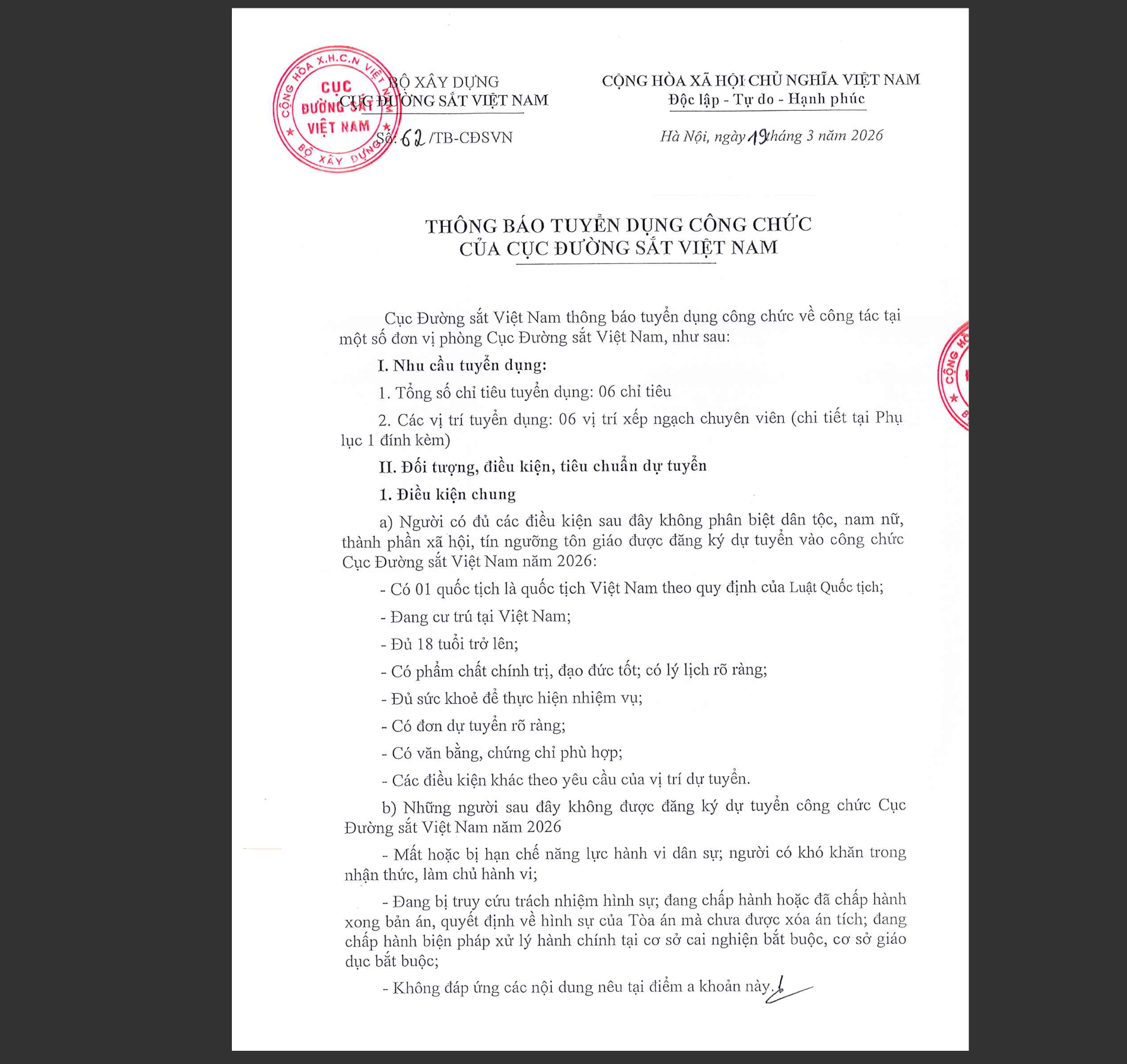 Cục Đường sắt Việt Nam thông báo tuyển 6 công chức làm việc tại các phòng chuyên môn của Cục. Vị trí việc làm dự tuyển; yêu cầu về trình độ, chuyên ngành đào tạo; các điều kiện khác được quy định cụ thể theo thông báo đính kèm: