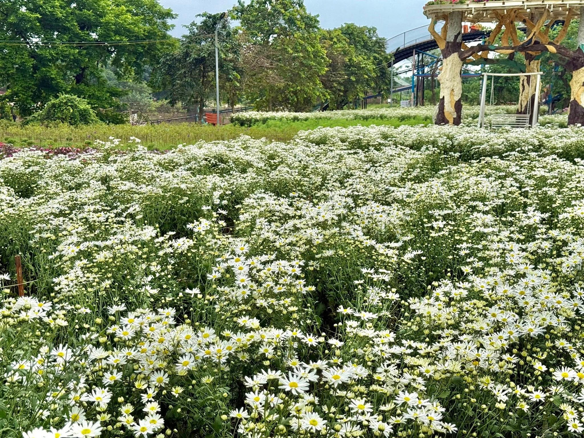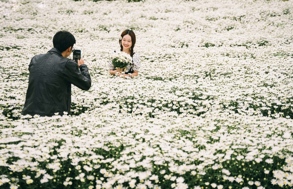 Những ngày này, các vườn hoa cúc họa mi tại Nhật Tân, Vườn hoa Tây Hồ,... đều khoe sắc, thu hút hàng nghìn người đến ngắm và chụp ảnh lưu niệm. Ảnh Vườn Hoa Bãi Đá Sông Hồng