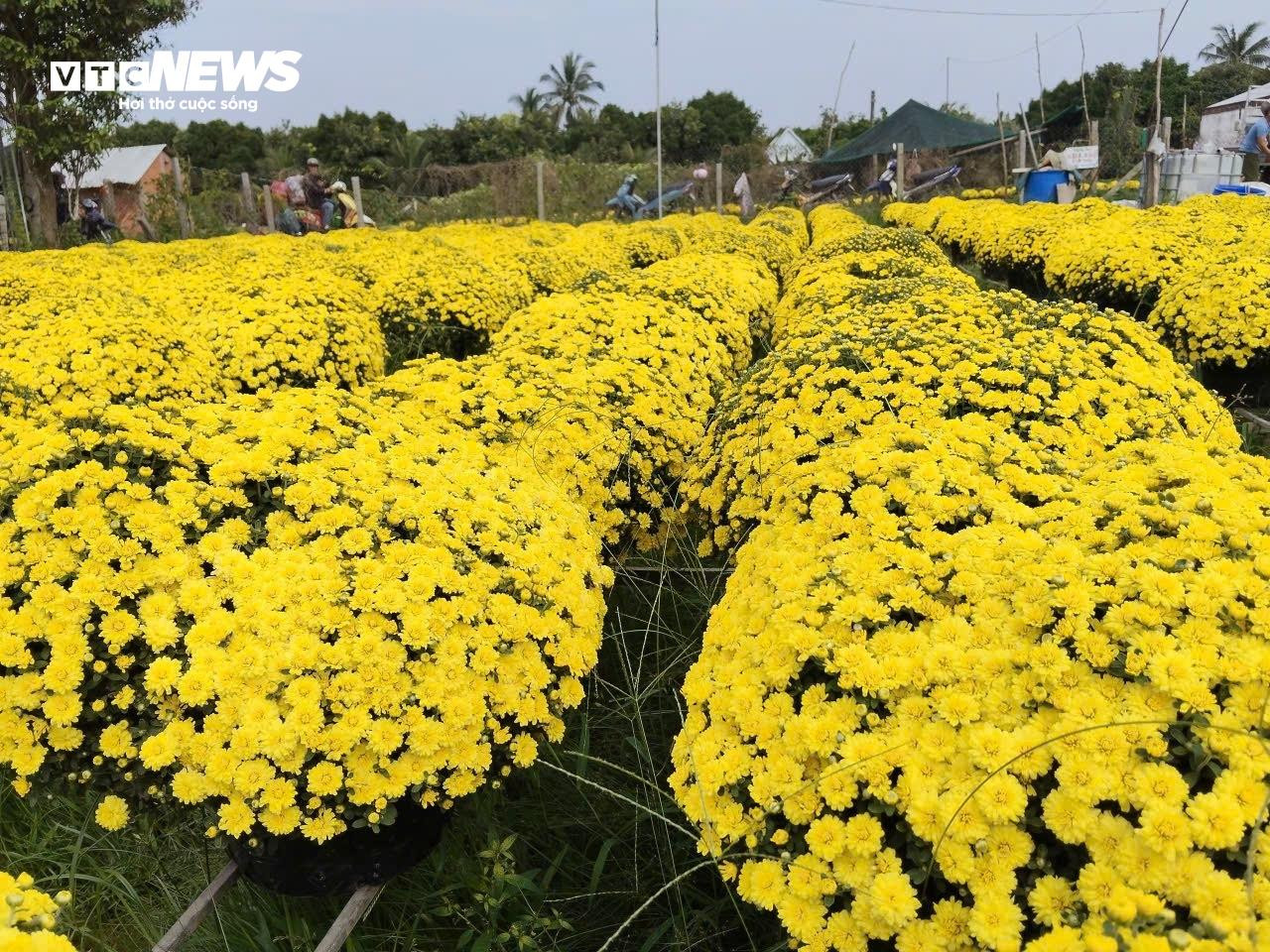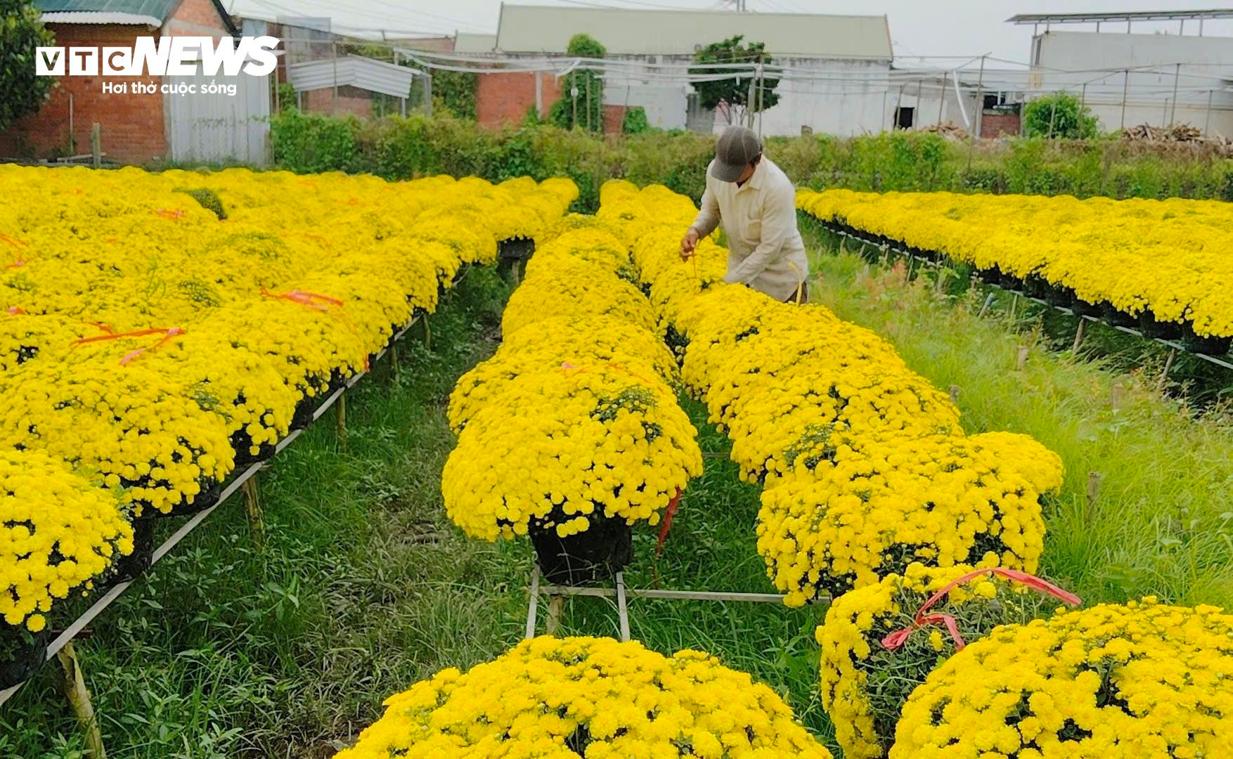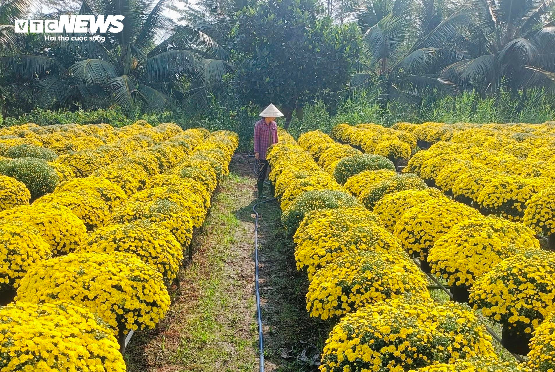 Những ngày này, dọc các tuyến đường dẫn vào xã Chợ Lách, sắc vàng của cúc mâm xôi đã phủ kín nhiều nhà vườn. Hoa nở đều, tròn tán, màu sắc đẹp, nhưng trái ngược với vẻ rực rỡ ấy là nỗi lo hiện rõ trên gương mặt người trồng hoa.