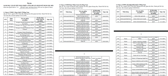 Danh sách một số sản phẩm do 3 doanh nghiệp tự nguyện thu hồi phiếu công bố mỹ phẩm.