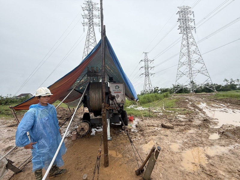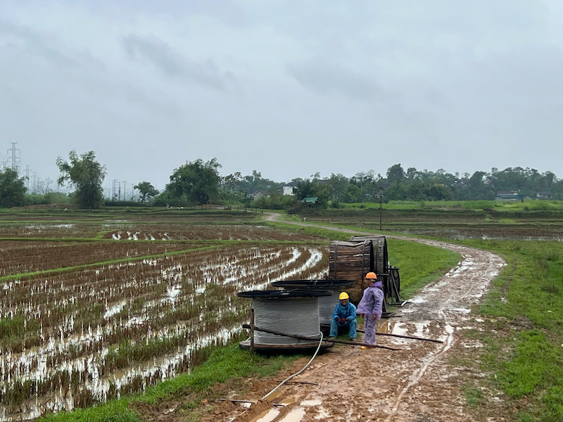 Máy hãm và flycam được sử dụng để kéo dây, rút ngắn thời gian thi công lẫn không ảnh hưởng nhiều tới hoa mầu và cây cối của người dân.