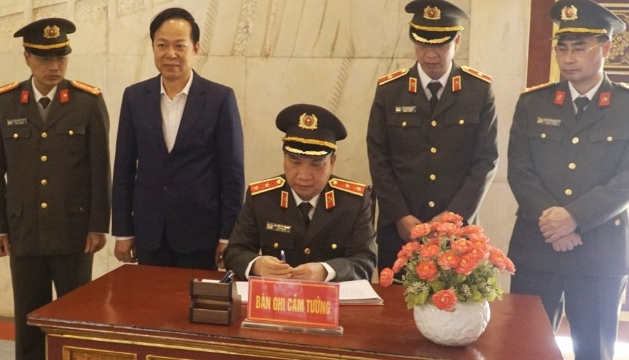 Trung tướng Nguyễn Sỹ Quang, Cục trưởng Cục An ninh kinh tế, Bộ Công an thành kính ghi cảm tưởng vào Sổ vàng lưu niệm của Khu di tích.
