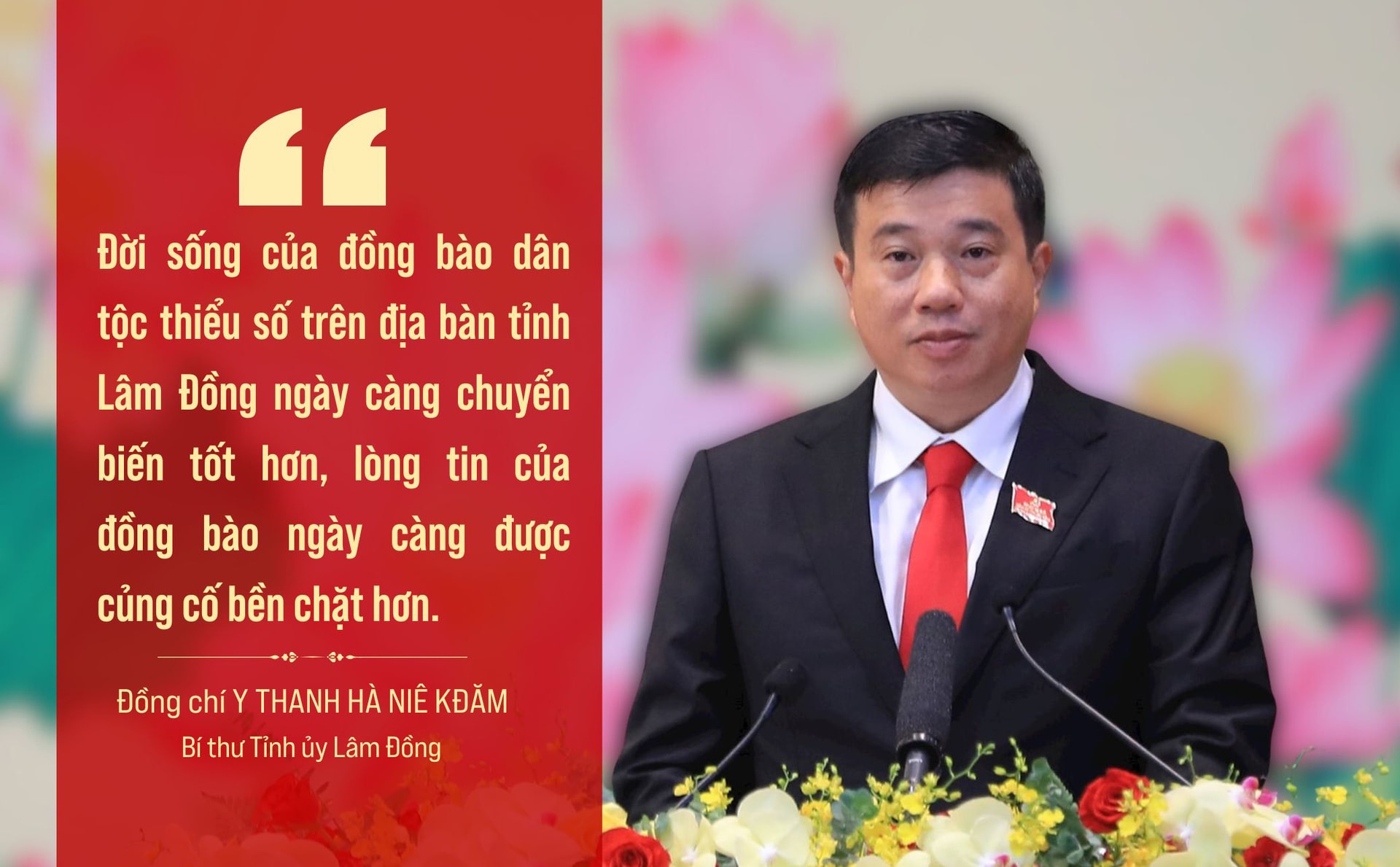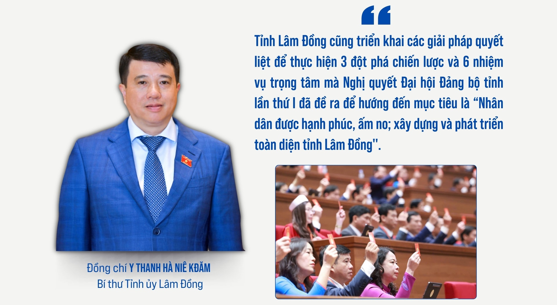 Đồng chí Bí thư Tỉnh ủy Lâm Đồng Y Thanh Hà Niê Kđăm: Đây là mục tiêu, là quyết tâm chính trị của Đảng bộ tỉnh Lâm Đồng; là khát vọng mãnh liệt của hơn 124 nghìn đảng viên trong Đảng bộ và gần 3,9 triệu người dân Lâm Đồng sau hợp nhất trong không gian phát triển mới; thể hiện quyết tâm chung sức, đồng lòng cùng cả nước tự cường, tự tin, tiến mạnh trong kỷ nguyên vươn mình của dân tộc, vì hòa bình, độc lập, dân chủ, giàu mạnh, phồn vinh, văn minh, hạnh phúc, vững bước đi lên chủ nghĩa xã hội.