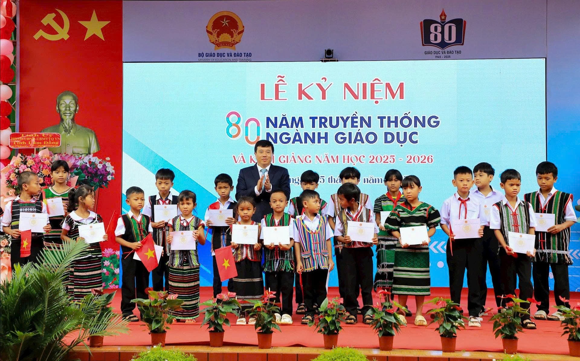Các đồng chí: Y Thanh Hà Niê Kđăm, Ủy viên Ban Chấp hành Trung ương Đảng, Bí thư Tỉnh ủy, Trưởng Đoàn ĐBQH tỉnh; Hồ Văn Mười, Phó Bí thư Tỉnh ủy, Chủ tịch UBND tỉnh Lâm Đồng tặng quà cho học sinh vượt khó học giỏi xã Thuận An