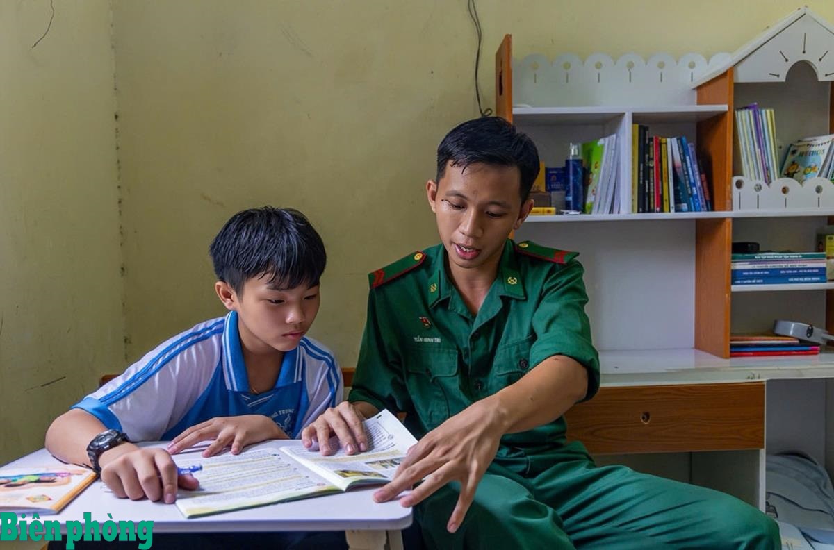 Chiến sĩ Đồn Biên phòng Lạc Quới dạy kèm môn Tiếng Việt cho em Nguyễn Văn Duy Chương. Ảnh: Ngọc Hòa