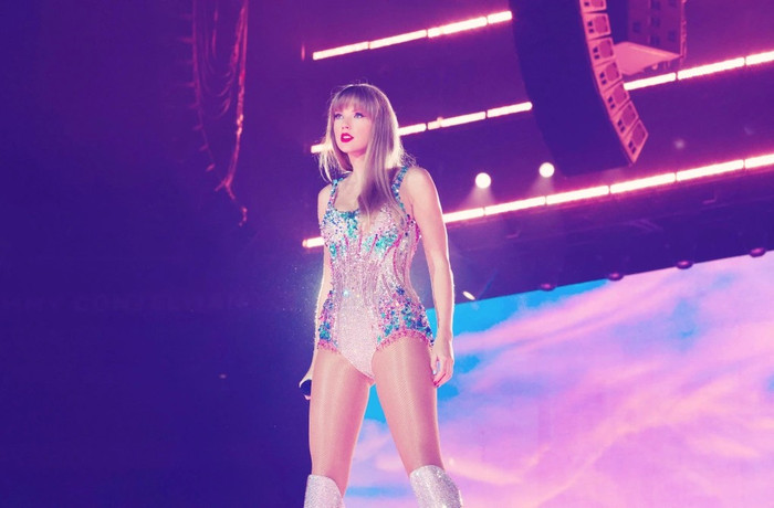 Trong khi đó, Taylor Swift cũng diện bodysuit ôm sát và đính đá lấp lánh, nhưng ê-kíp lại tạo ra hiệu quả trái ngược. Các thiết kế của cô được dựng phom chắc, chất liệu có độ dày kiểm soát và cấu trúc rõ ràng, đảm bảo hình dáng không biến đổi khi di chuyển. Bề mặt hạn chế độ bóng, màu sắc được lựa chọn đồng bộ với layout ánh sáng, giúp trang phục bắt mắt nhưng không bị “phản chủ” dưới hàng chục nguồn đèn sân khấu.