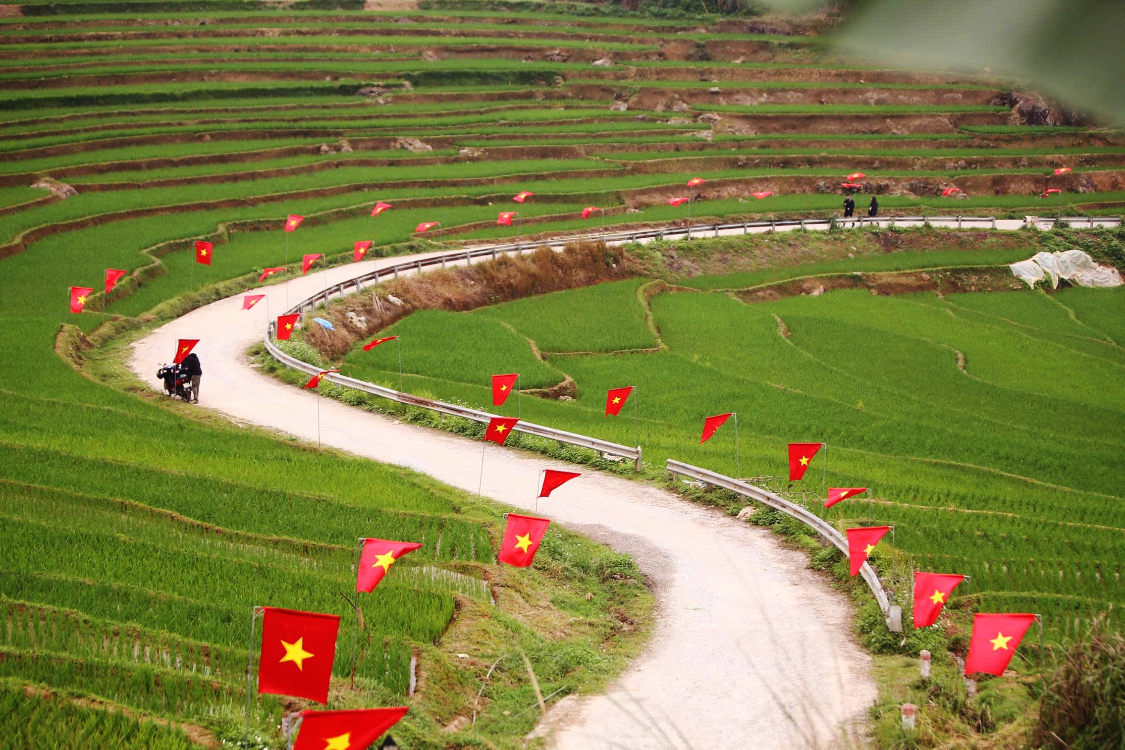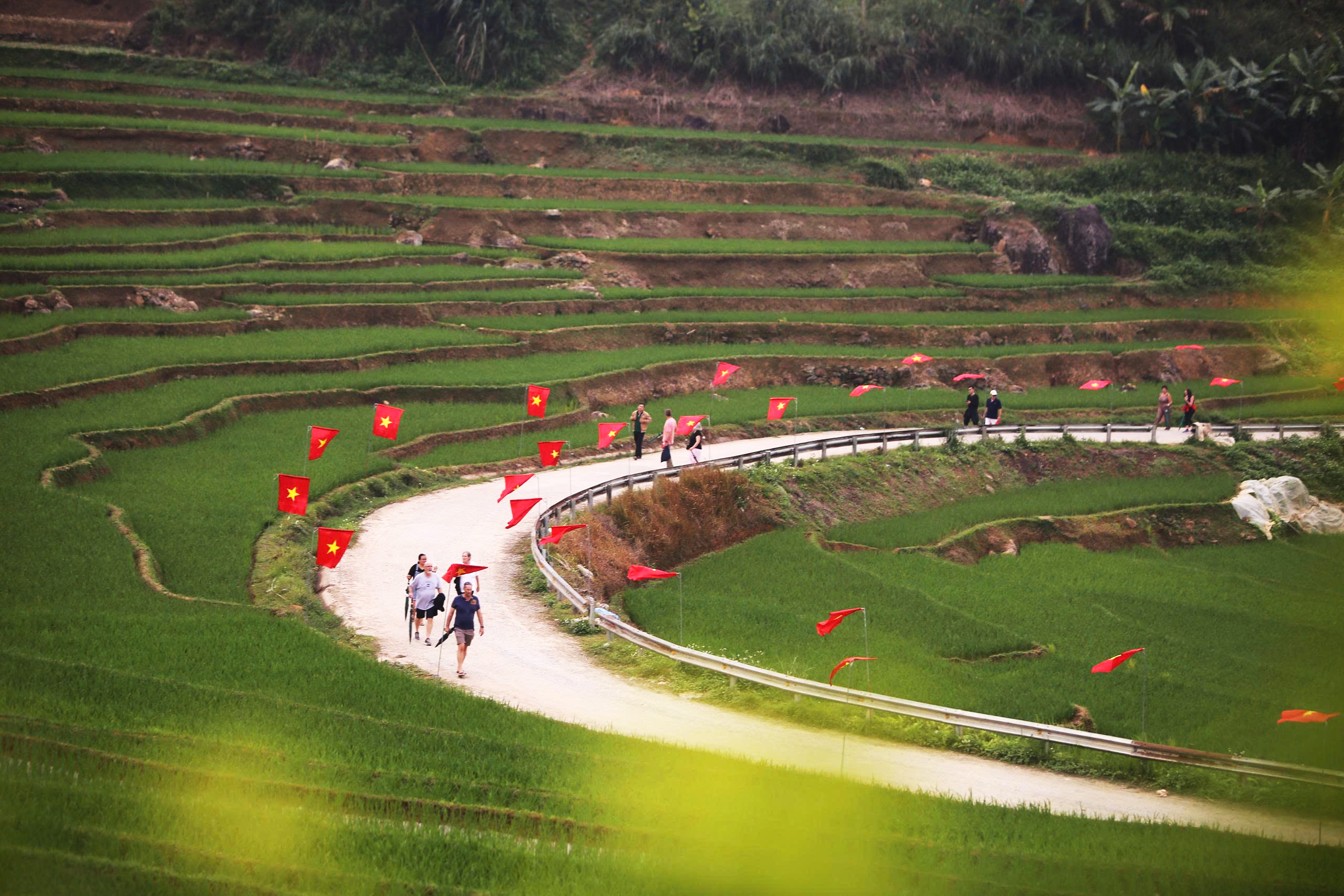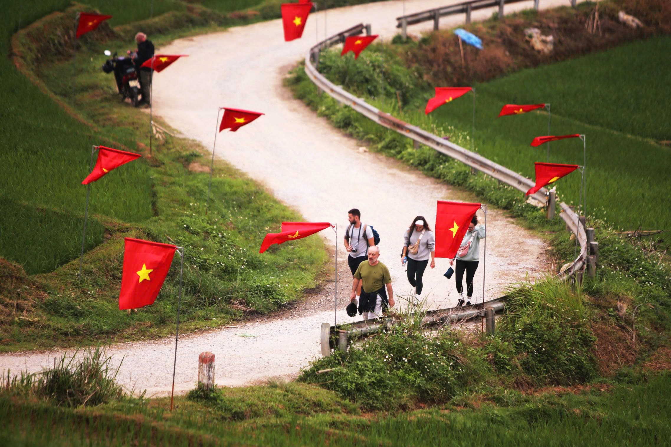 Trên “cung đường chữ S” còn có những du khách nước ngoài dạo bước dưới hàng cờ đỏ tung bay, hai bên là những thửa ruộng bậc thang xanh mướt trải dài...