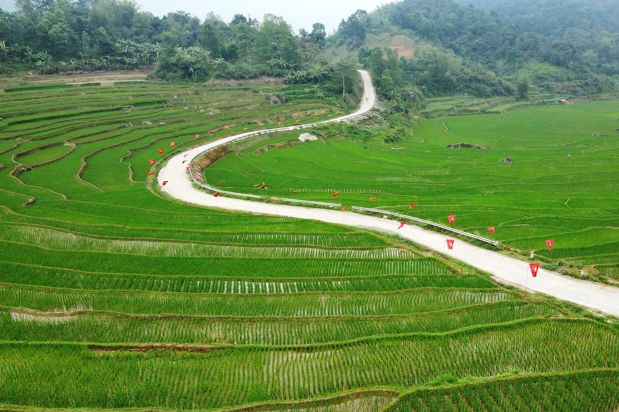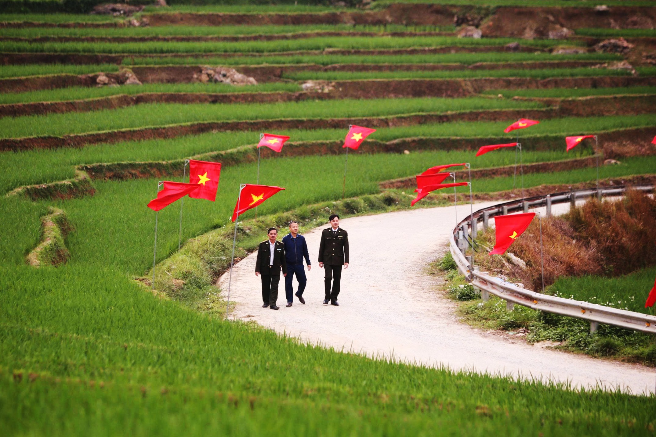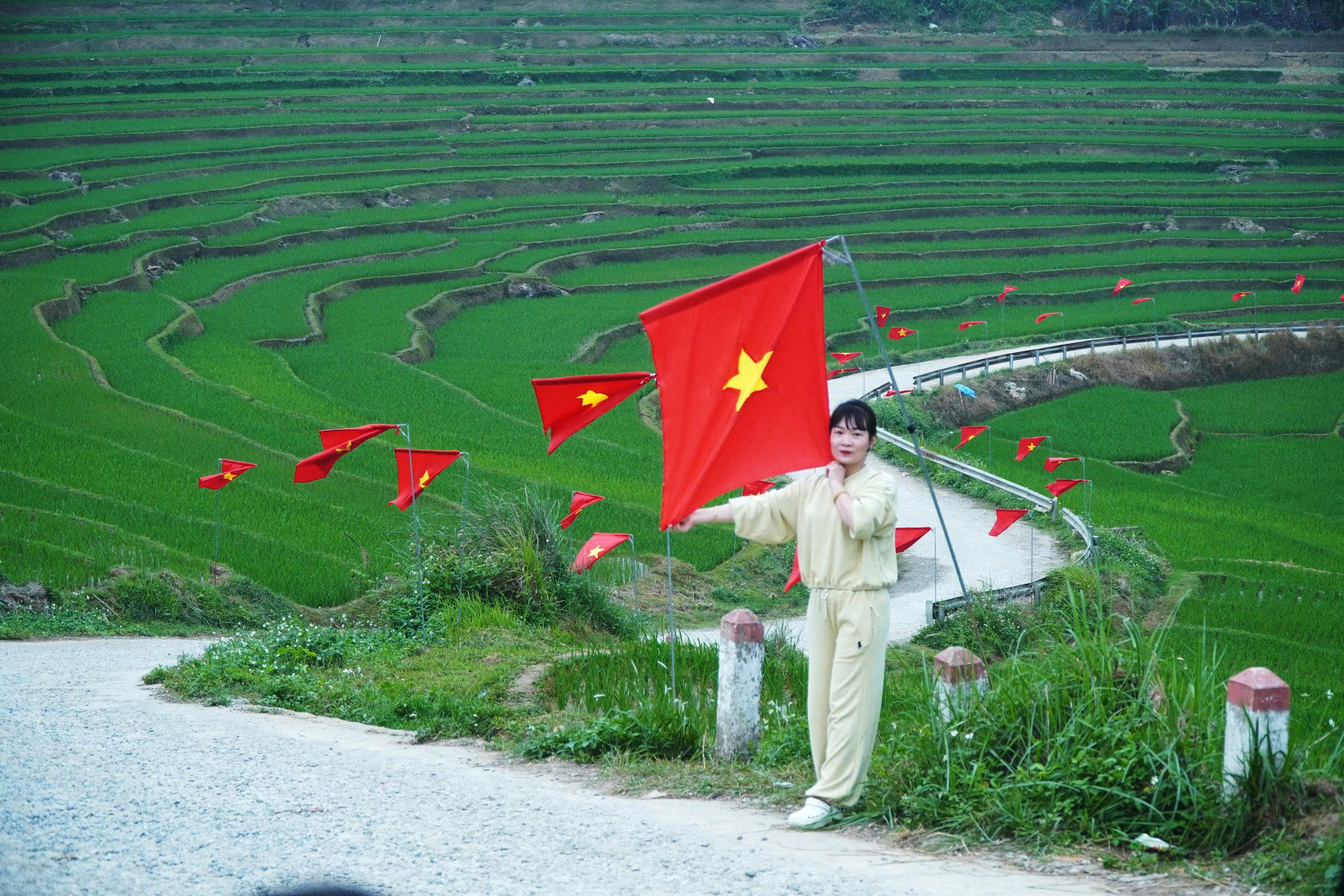 Trên “cung đường chữ S” còn có những du khách nước ngoài dạo bước dưới hàng cờ đỏ tung bay, hai bên là những thửa ruộng bậc thang xanh mướt trải dài...