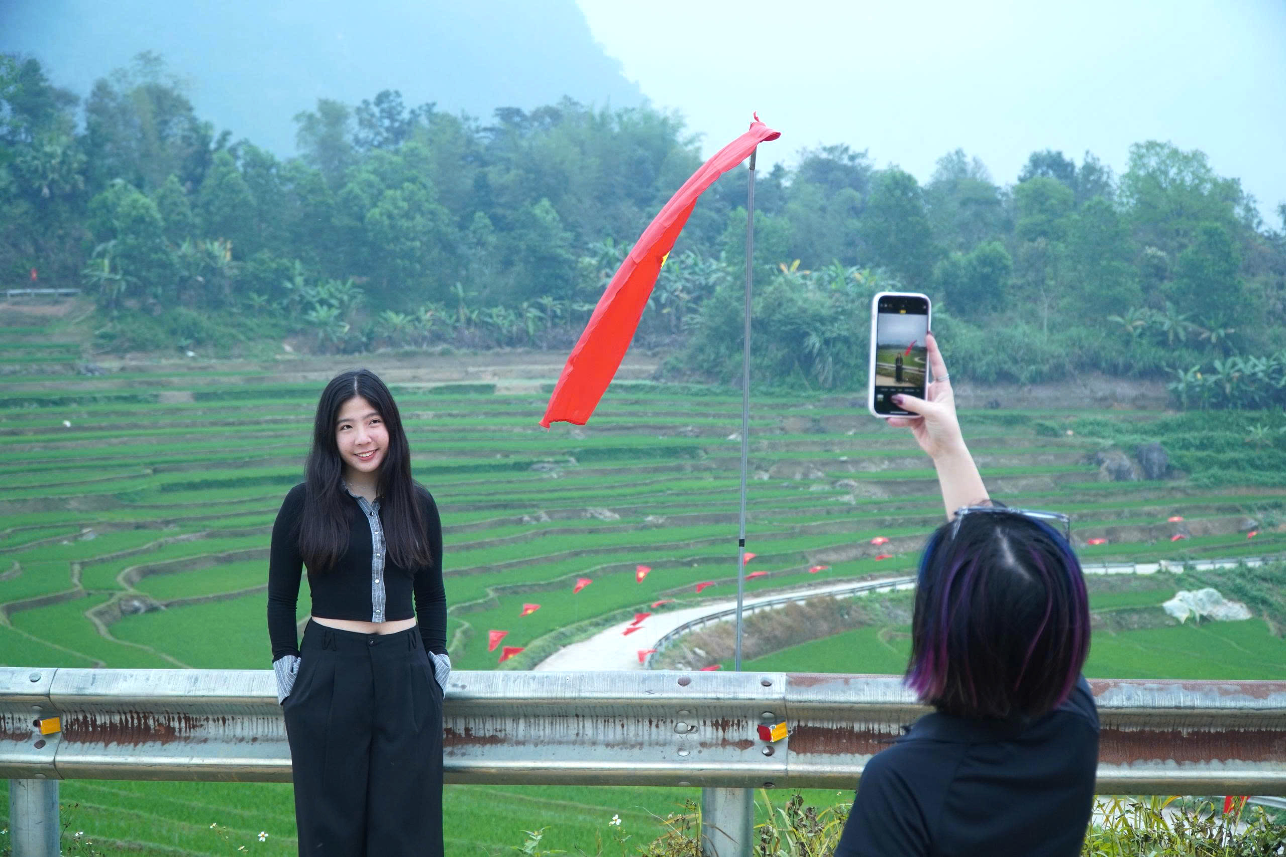 Tại đây, nhiều bạn trẻ tranh thủ ghi lại những khoảnh khắc đẹp trên “cung đường chữ S” rợp cờ hoa.