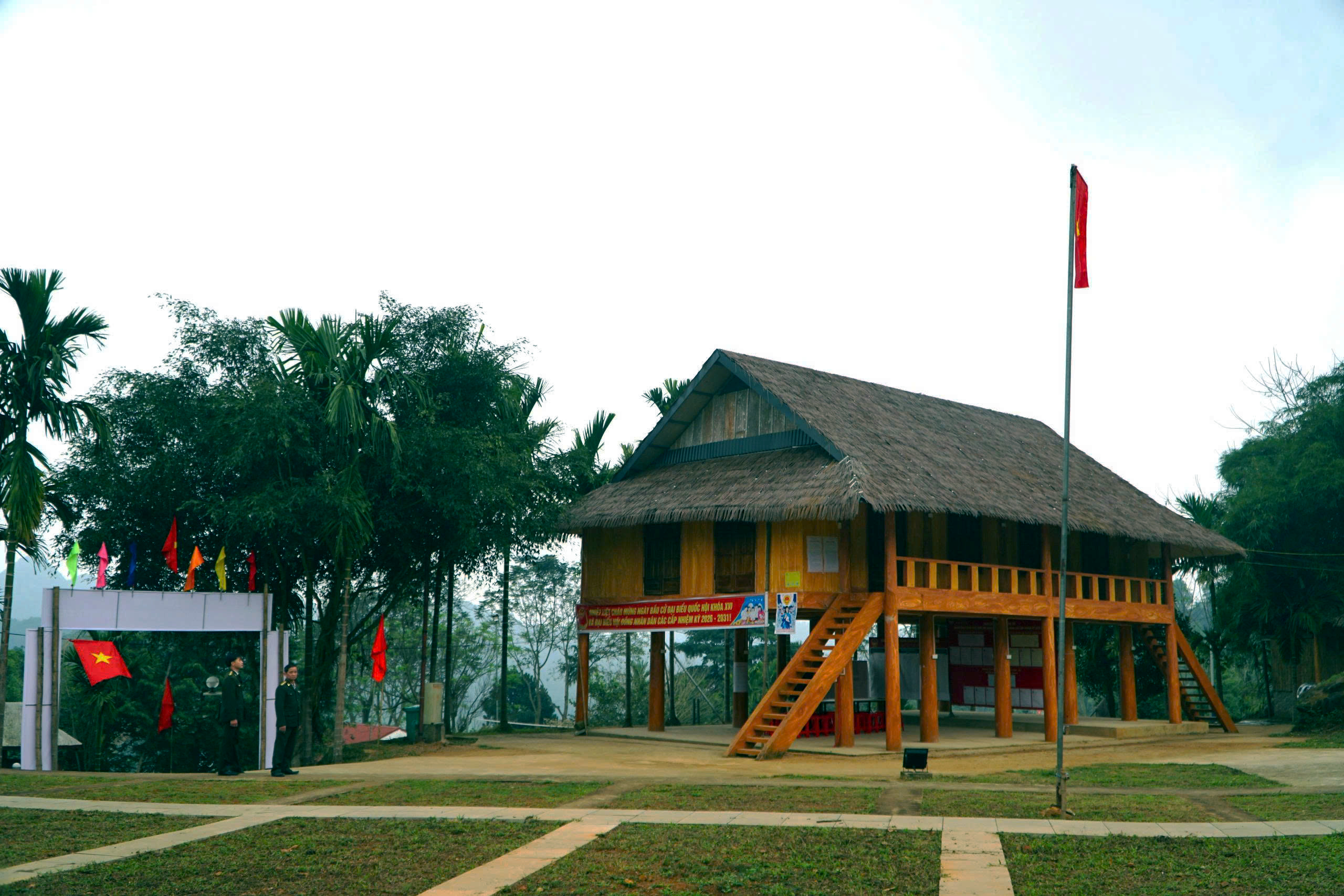 Những ngôi nhà sàn nép mình bên sườn núi đồng loạt treo cờ Tổ quốc trước hiên, góp phần tạo nên không khí phấn khởi khắp bản làng.