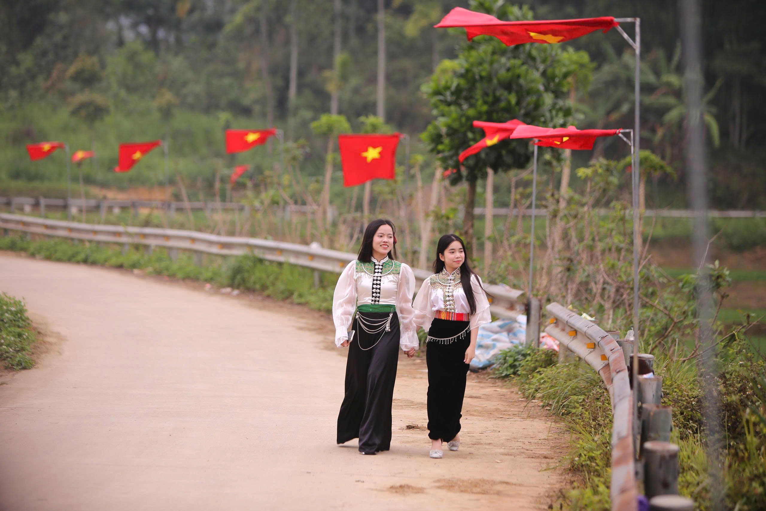 Những lá cờ Tổ quốc tung bay giữa núi rừng xanh thẳm tạo nên khung cảnh vừa trang nghiêm vừa sinh động, lan tỏa không khí náo nức hướng về ngày hội lớn của toàn dân.