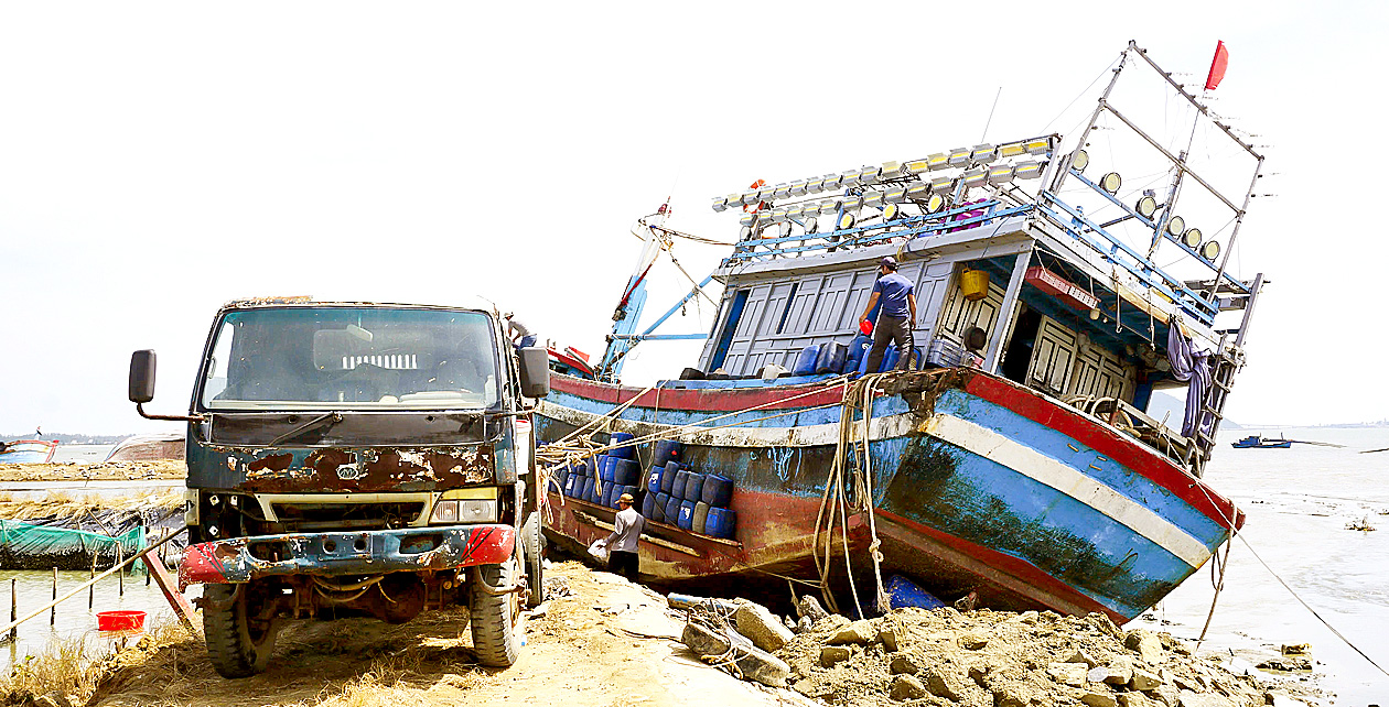 Ngư dân dùng xe tải để kéo tàu cá mắc cạn tại đầm Đề Gi (tỉnh Gia Lai)
