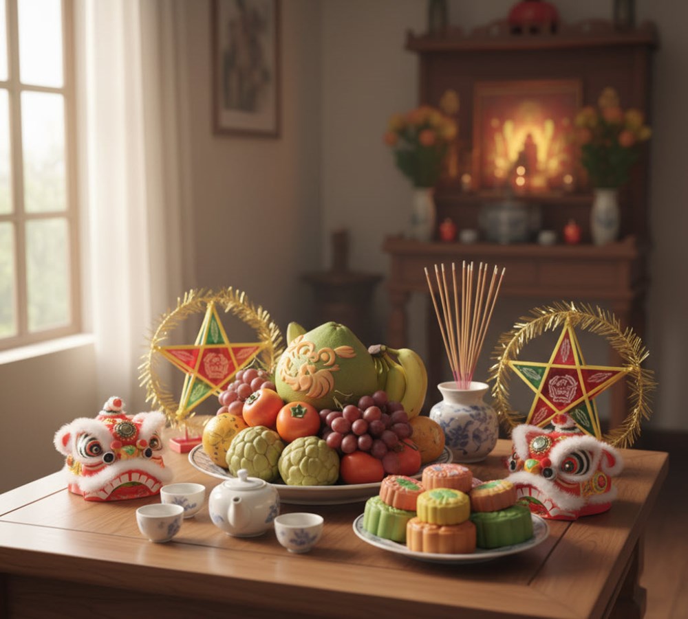 Chuẩn bị lễ vật: mâm cỗ chay/mặn, bánh trung thu, hoa quả, đèn/nến, hương.