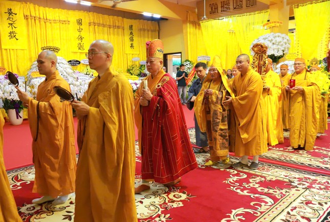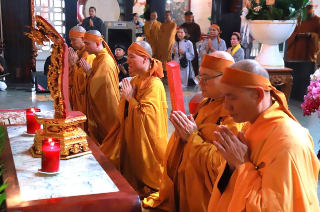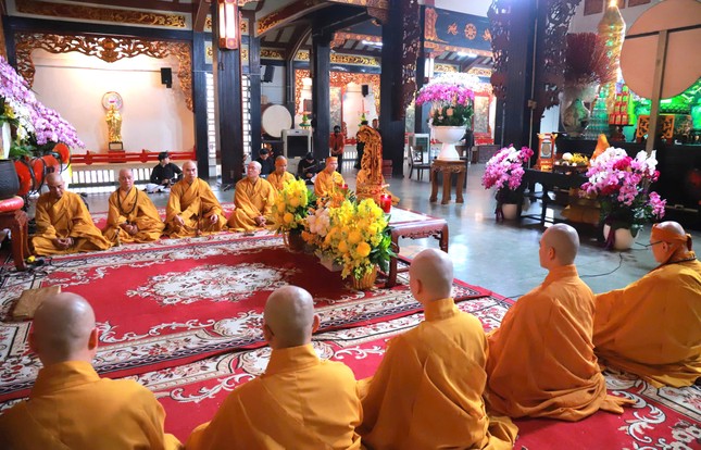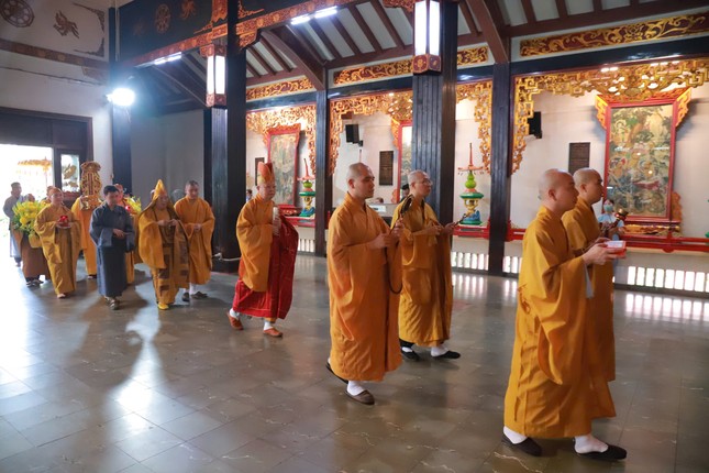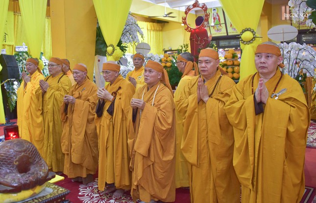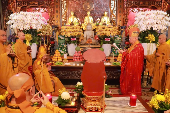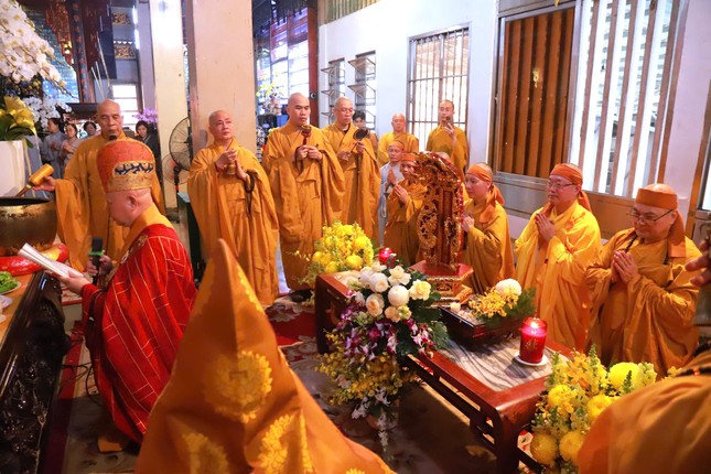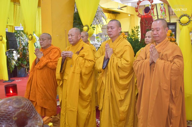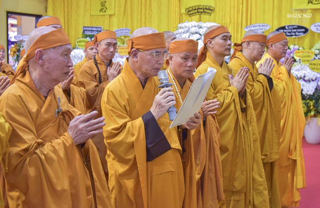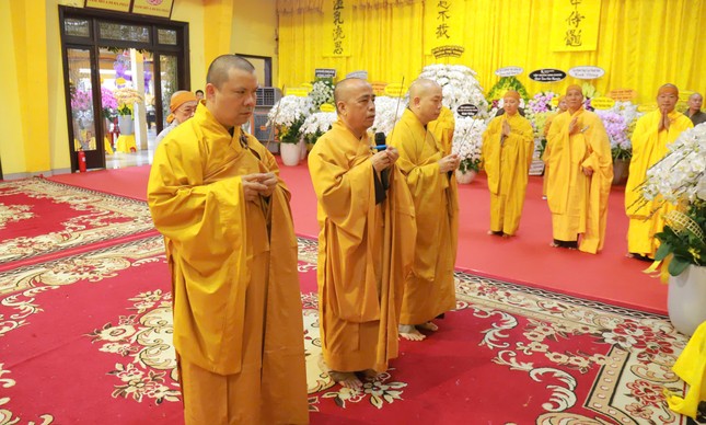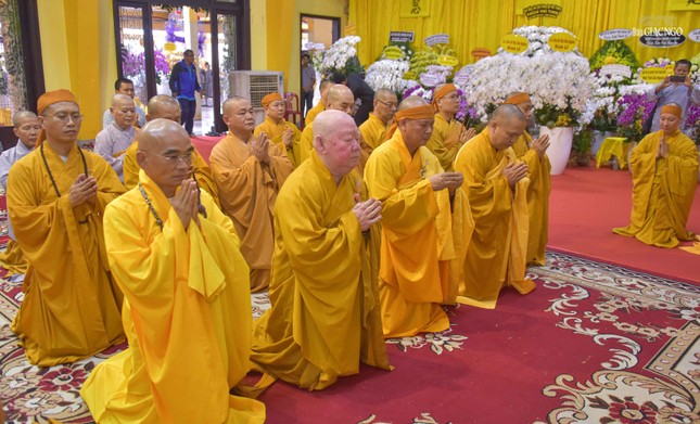 Hòa thượng Thích Lệ Trang, Phó Chủ tịch Hội đồng Trị sự, Trưởng ban Nghi lễ Trung ương cùng chư tôn đức Ban Nghi lễ cử hành nghi thức cung thỉnh linh mô, long vị Trưởng lão Hòa thượng tân viên tịch lễ Phật, yết Tổ tại chánh điện và Tổ đường chùa Vĩnh Nghiêm.