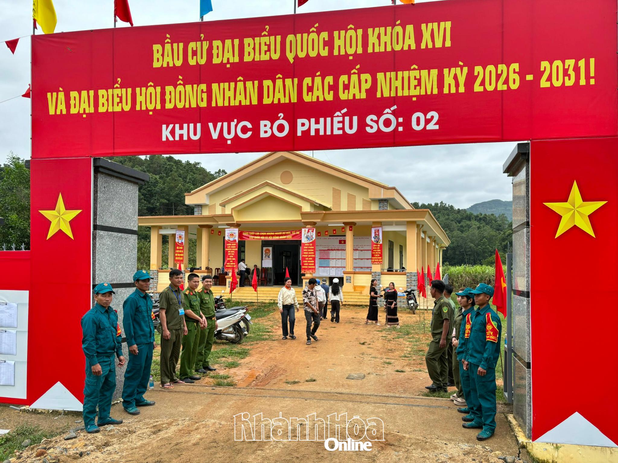Lực lượng Công an xã Tây Khánh Vĩnh phối hợp với lực lượng an ninh trật tự cơ sở, dân quân xã thực hiện nhiệm vụ tại Khu vực bỏ phiếu số 2, thôn Tà Gộc.