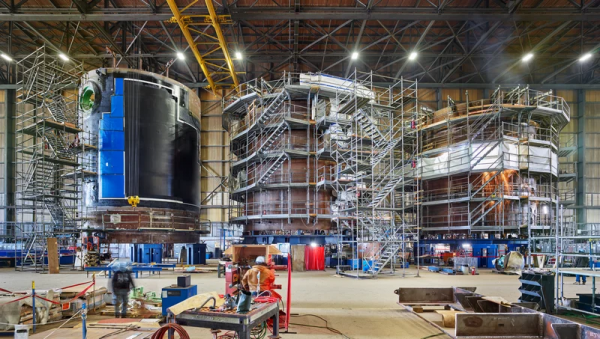 Ảnh chụp 3 hình trụ khổng lồ được bao quanh bởi giàn giáo, phía trước là công nhân đóng tàu.
