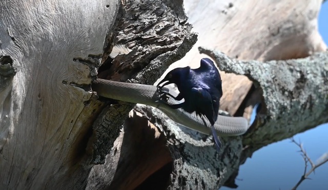 Đoạn video do một hướng dẫn viên du lịch ghi lại cho thấy cảnh tượng hiếm gặp khi con rắn mamba đen bị phát hiện đang trườn rất cao trên gần ngọn một cây Ana để chui vào tổ chim. Ngay lập tức, hai con sáo đá xuất hiện và bắt đầu những vòng tấn công không ngừng nghỉ, liên tục bổ nhào từ trên cao xuống, hòng xua đuổi kẻ săn mồi đáng sợ.