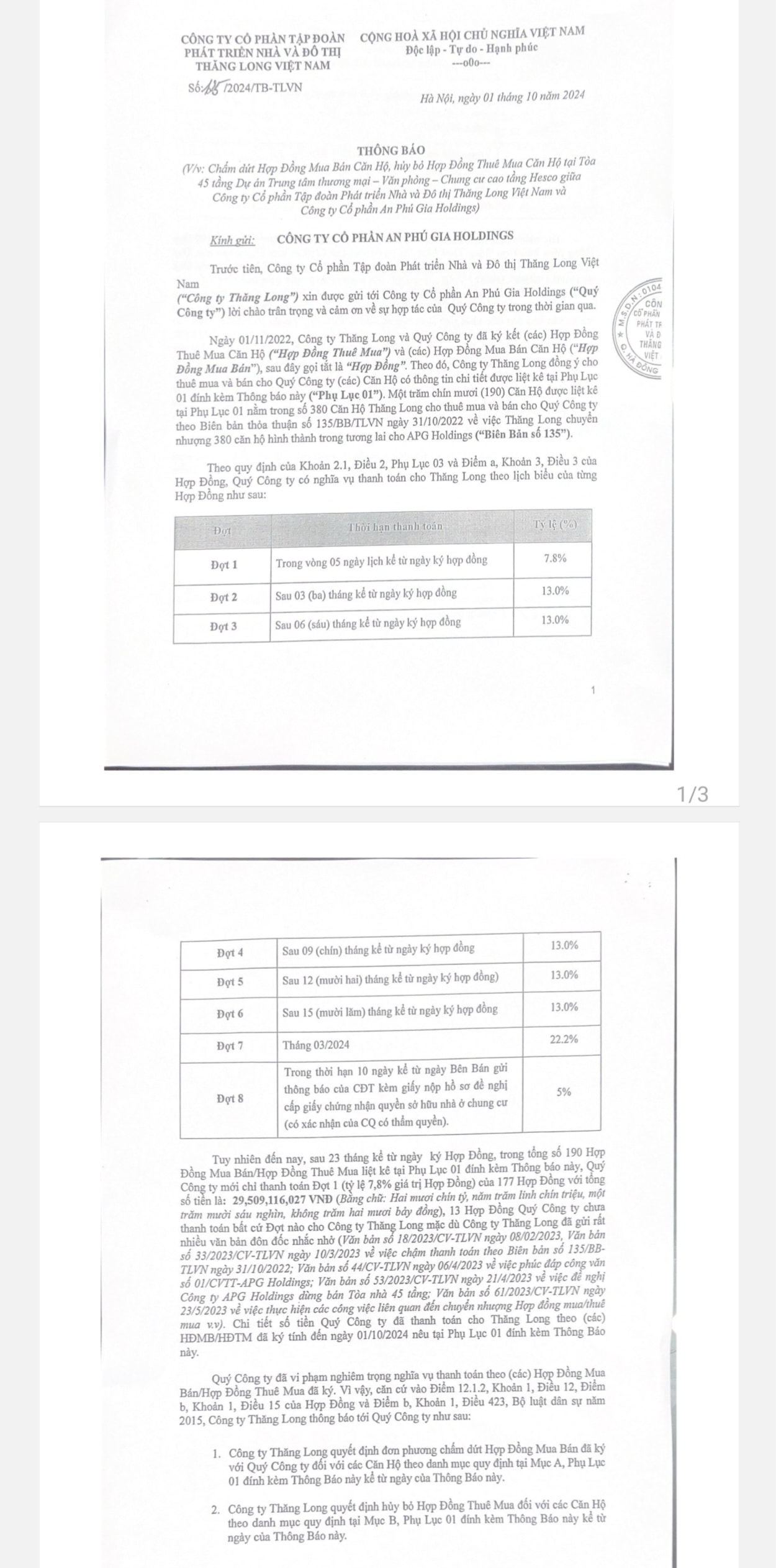 Theo đó, tại công văn số 179/2024/CV-TLVN, Chủ đầu tư cho biết APG Holdings và ông Phan Thế Hoàng đã thu về số tiền hơn 335 tỉ đồng từ 190 hợp đồng chuyển nhượng căn hộ, nhưng mới chỉ thanh toán cho công ty Thăng Long VN hơn 79 tỉ đồng. Sự chênh lệch lớn về dòng tiền này là điểm mấu chốt khiến Chủ đầu tư đơn phương chấm dứt hợp đồng và là căn cứ để khách hàng tố cáo hành vi chiếm đoạt tài sản.