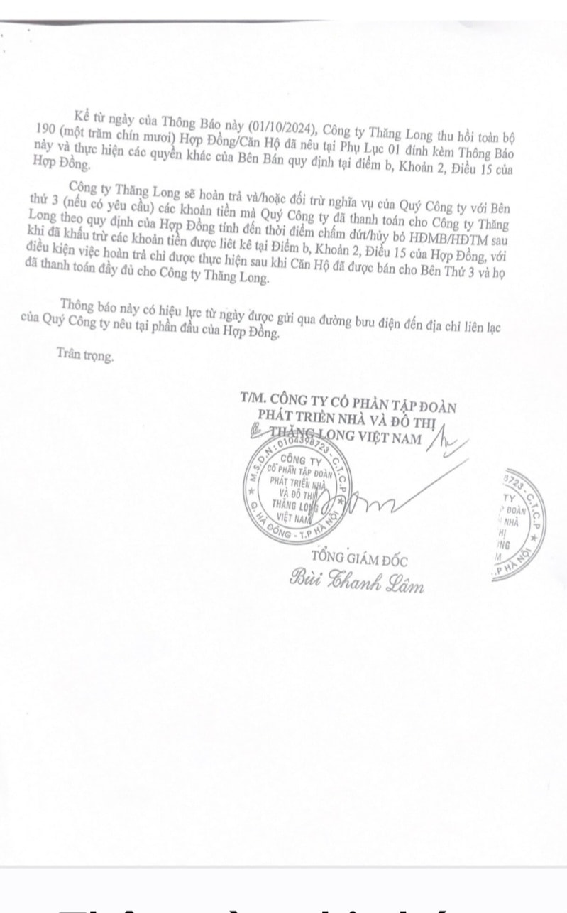 Tuy nhiên, ngày 1.10.2024, Chủ đầu tư Thăng Long VN đã ban hành văn bản số 125/2024/TB-VN chấm dứt hợp đồng với APG Holdings. Hành động này kéo theo nguy cơ thu hồi 190 căn hộ mà khách hàng đã đóng tiền mua.