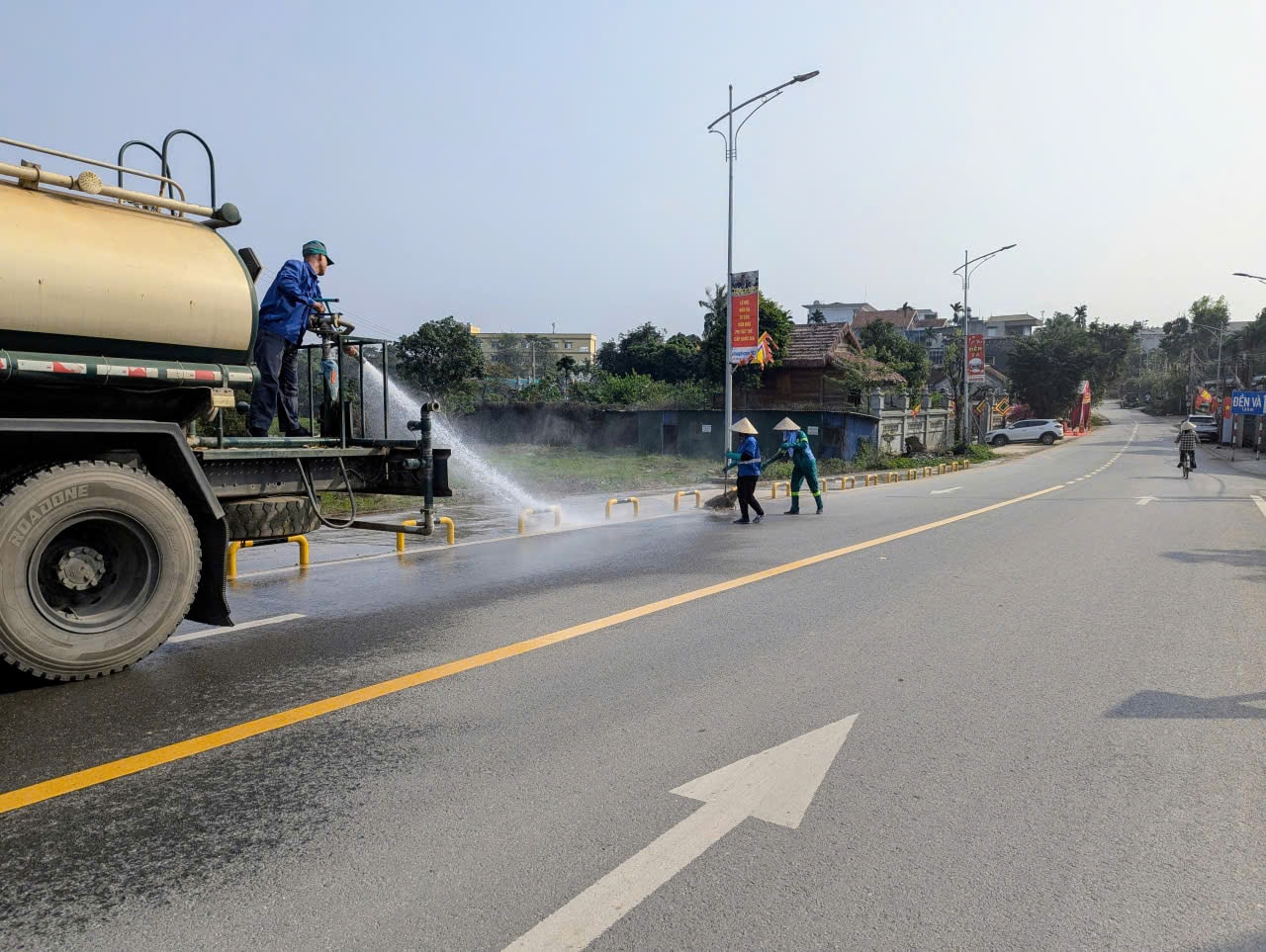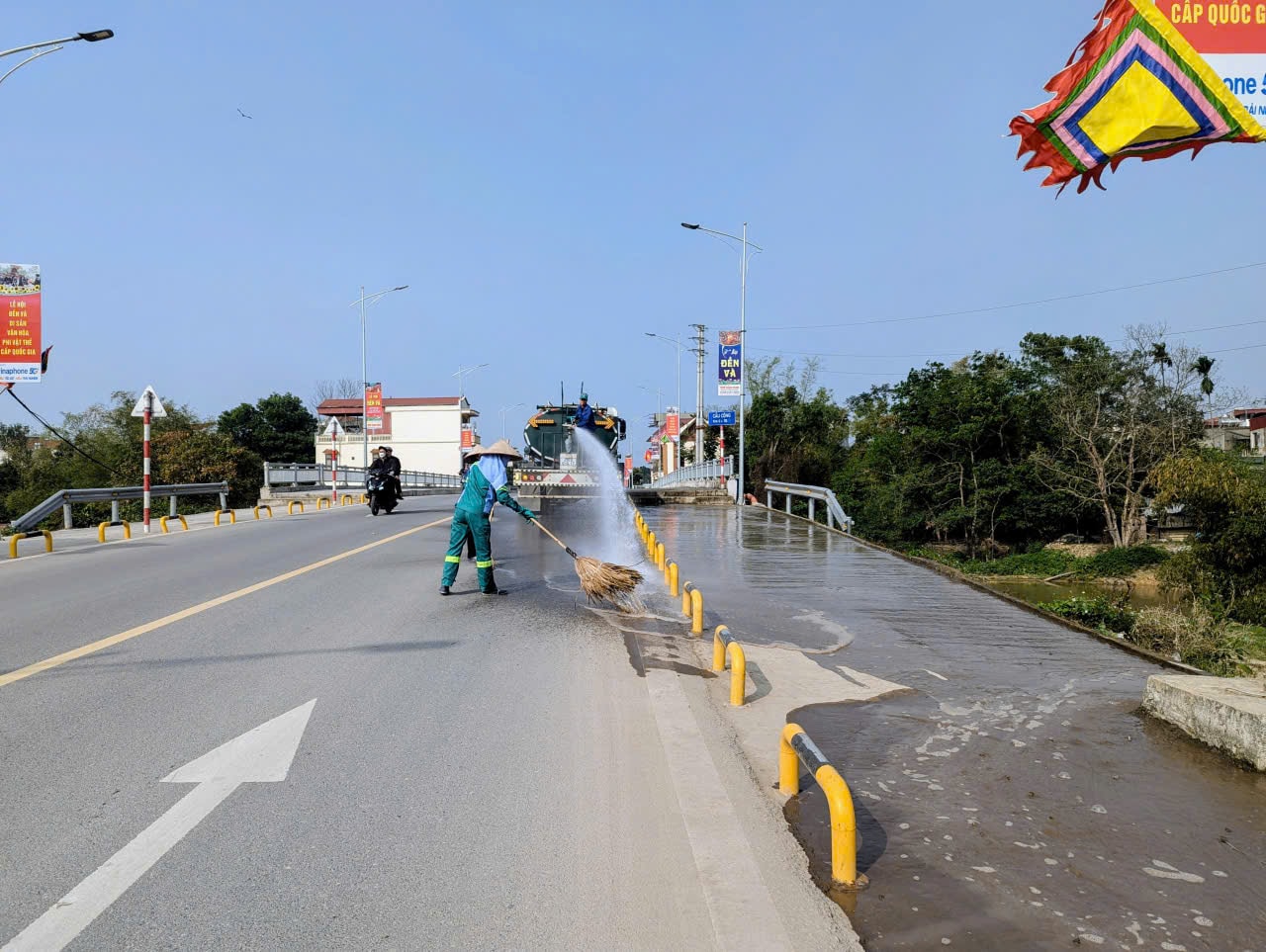 Công nhân vệ sinh môi trường dọn rác, rửa đường trên tuyến đường chính vào Khu di tích đền Và. Ảnh: Nguyễn Quý