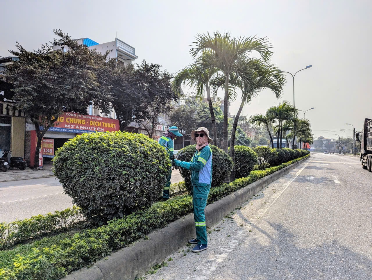 Những công nhân vệ sinh môi trường lặng lẽ cắt tỉa cây xanh, dọn dẹp vệ sinh trên đường La Thành. Ảnh: Nguyễn Quý