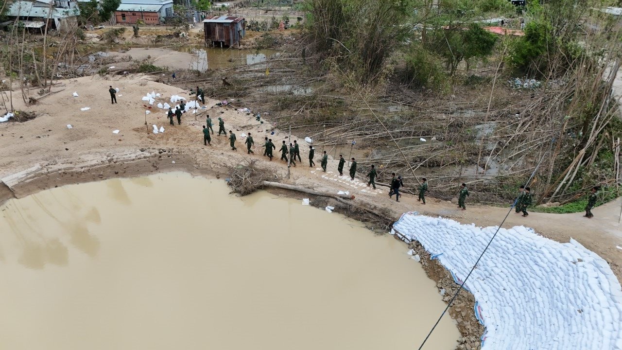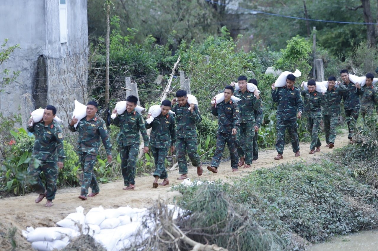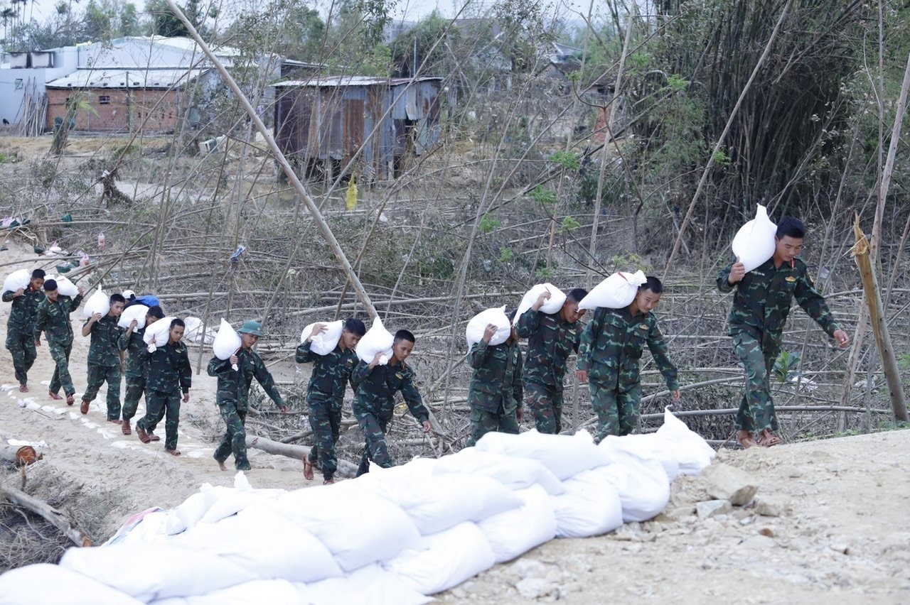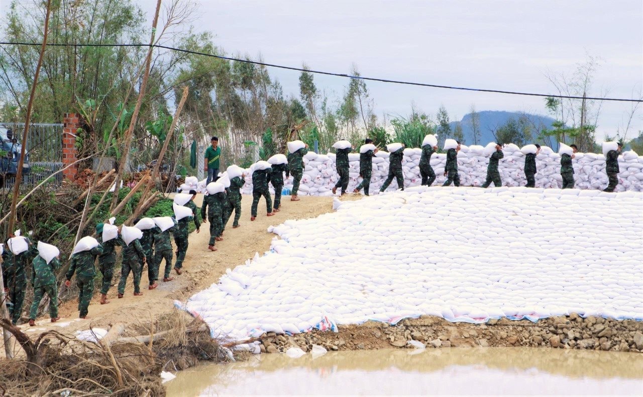 Để khắc phục khẩn cấp, Lữ đoàn 573 (Quân khu 5) đã phối hợp với cấp ủy, chính quyền địa phương huy động hơn 200 cán bộ, chiến sĩ cùng phương tiện chuyên dụng tham gia gia cố thân đê. Sáng 25/11, lực lượng quân đội bắt đầu triển khai đắp đê tại các điểm xung yếu.