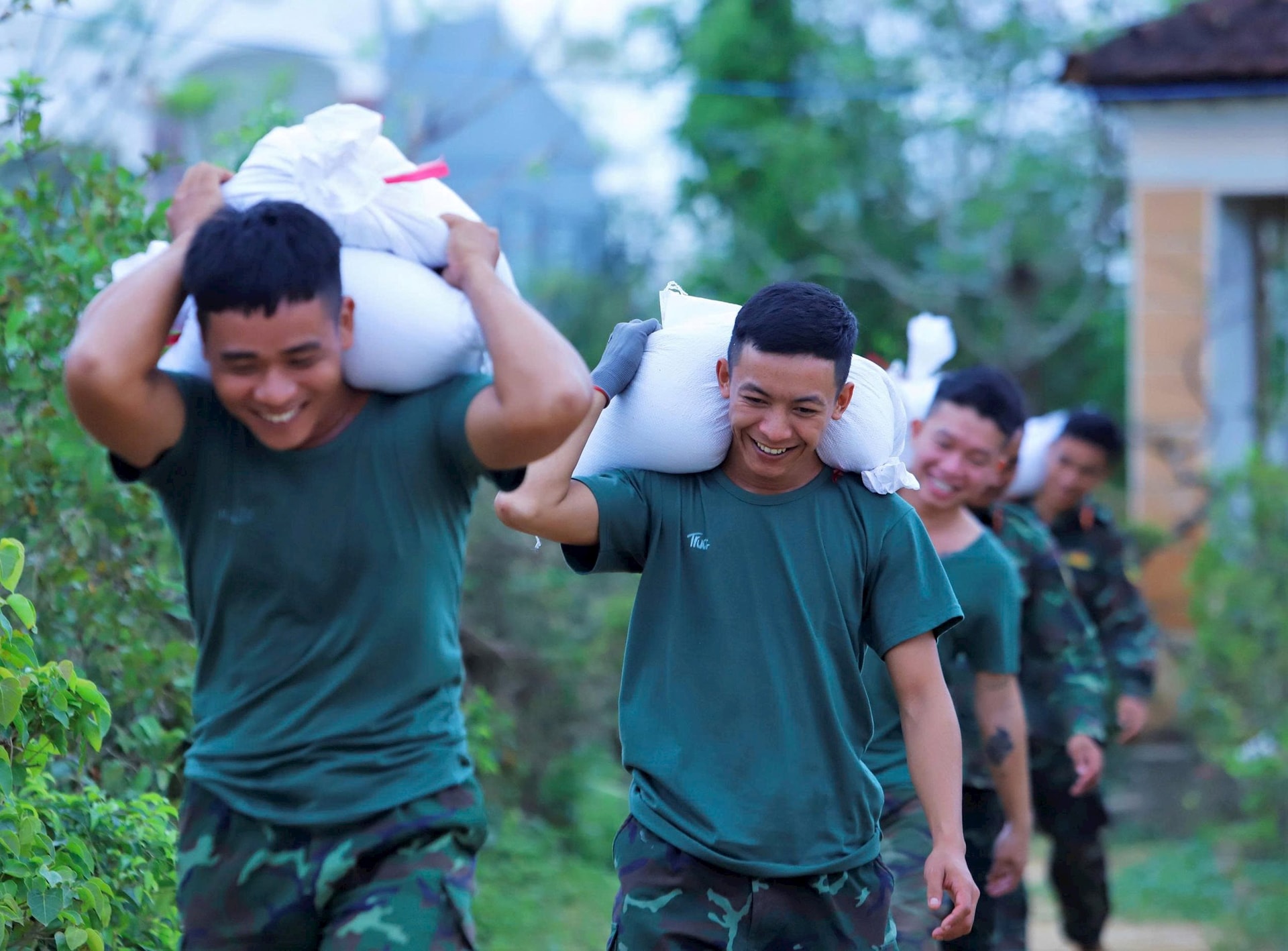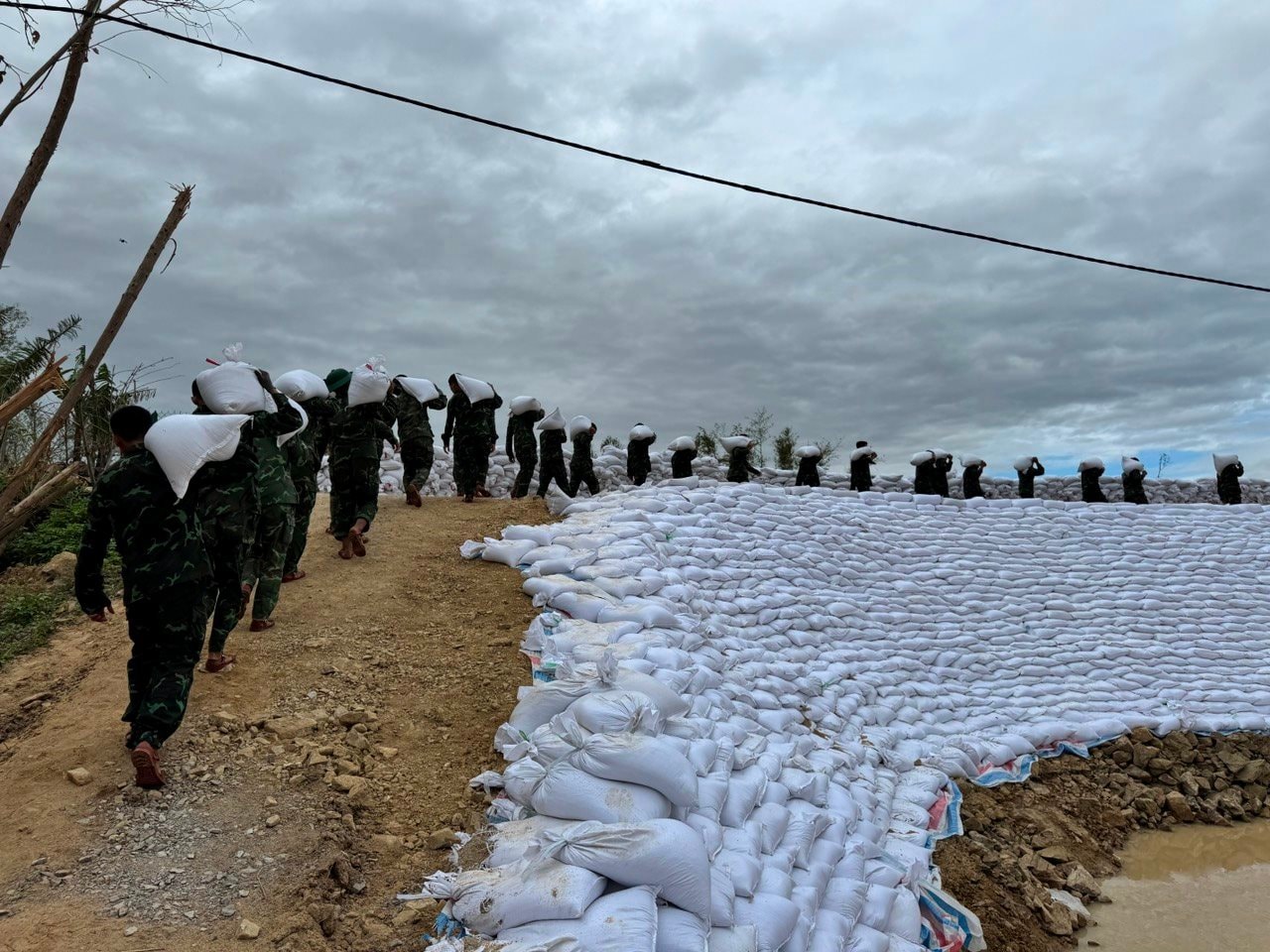 Những ngày qua, cán bộ, chiến sĩ Lữ đoàn 573 làm việc liên tục tại hai vị trí Vân Hội 1 và Luật Lễ. Bao cát được vác thủ công, vận chuyển hơn 200m đến vị trí vỡ để hàn khẩu. Dù mưa nắng thất thường, lực lượng quân đội vẫn duy trì thi công từ sáng đến đêm nhằm đảm bảo tiến độ.