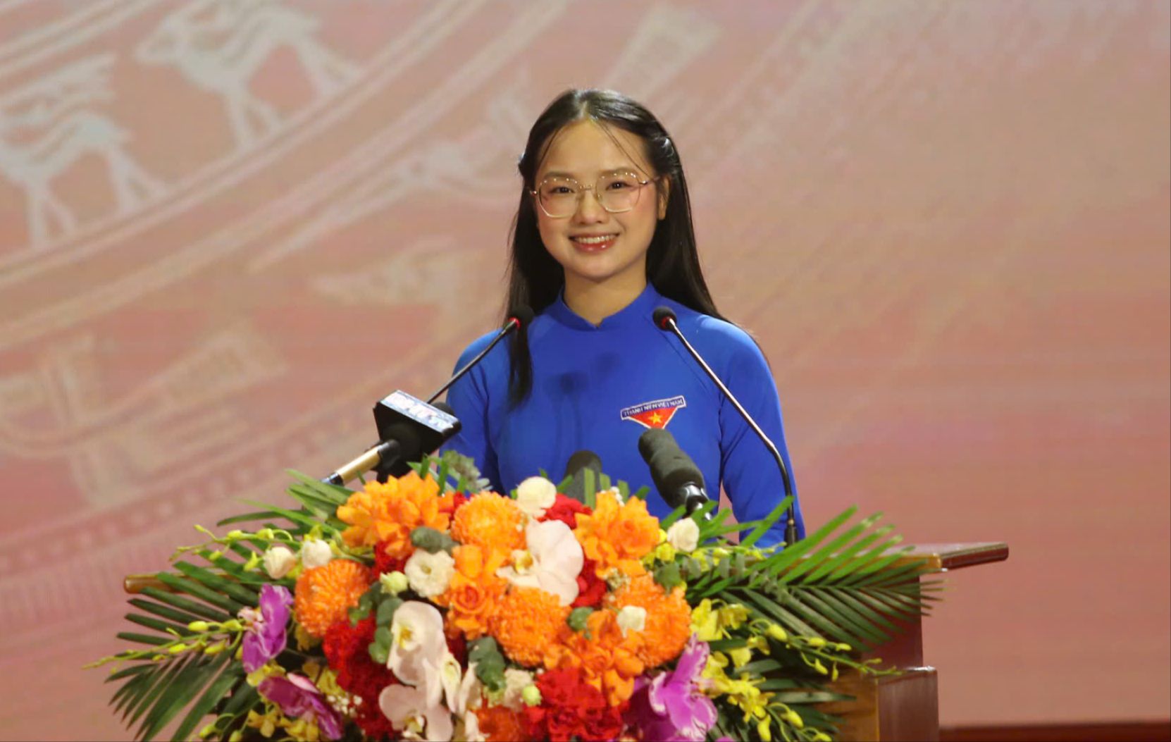 Em Bùi Hà Vy - đoàn viên Chi đoàn 11 Văn (Trường THPT Chuyên Hà Tĩnh), đại diện thế hệ trẻ tỉnh nhà phát biểu tại buổi lễ.