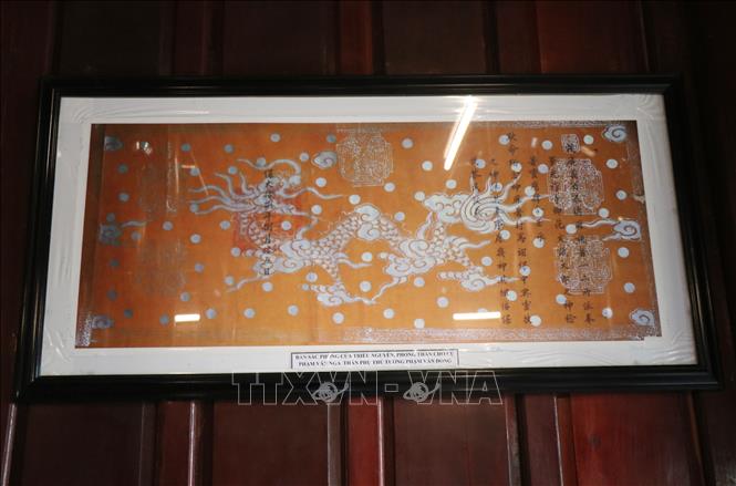 Bản sắc phong của Triều Nguyễn cho ông Phạm Văn Nga, thân phụ Thủ tướng Phạm Văn Đồng, được trưng bày tại khu lưu niệm.