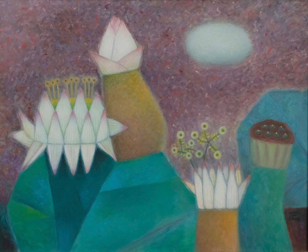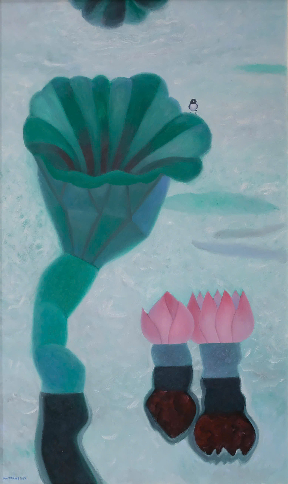 Nhẹ nhàng, hướng nội và tinh tế, Phùng Mỵ Trâm âm thầm nuôi dưỡng thế giới nghệ thuật của riêng mình. Những bức tranh của chị như những mảnh ghép cổ tích: những bông hoa khổng lồ với cấu trúc lạ mắt, những chú chim tròn trịa nép vào nhau dưới tán lá, hay hình ảnh phụ nữ và trẻ em xuất hiện như bước ra từ giấc mơ. Không gian tranh không tuân thủ quy luật viễn cận mà được cố ý gián đoạn, tạo một miền thị giác phi thực, nơi cảm xúc được tự do bộc lộ.