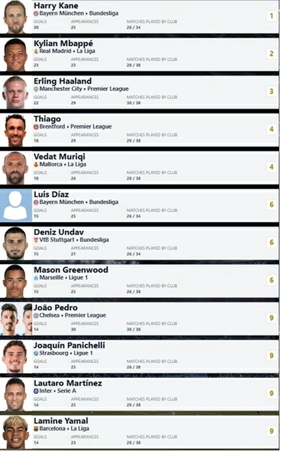 Ngoài những cầu thủ kể trên, nhóm đầu cuộc đua Golden Shoe còn có một số ngôi sao đáng chú ý như Luis Diaz (Bayern Munich), Greenwood (Marseille), Lautaro Martinez (Inter Milan) và Lamine Yamal (Barcelona). Trong đó, Greenwood và Luis Diaz đều đã ghi 15 bàn, còn Yamal và Martinez cùng có 14 bàn thắng.