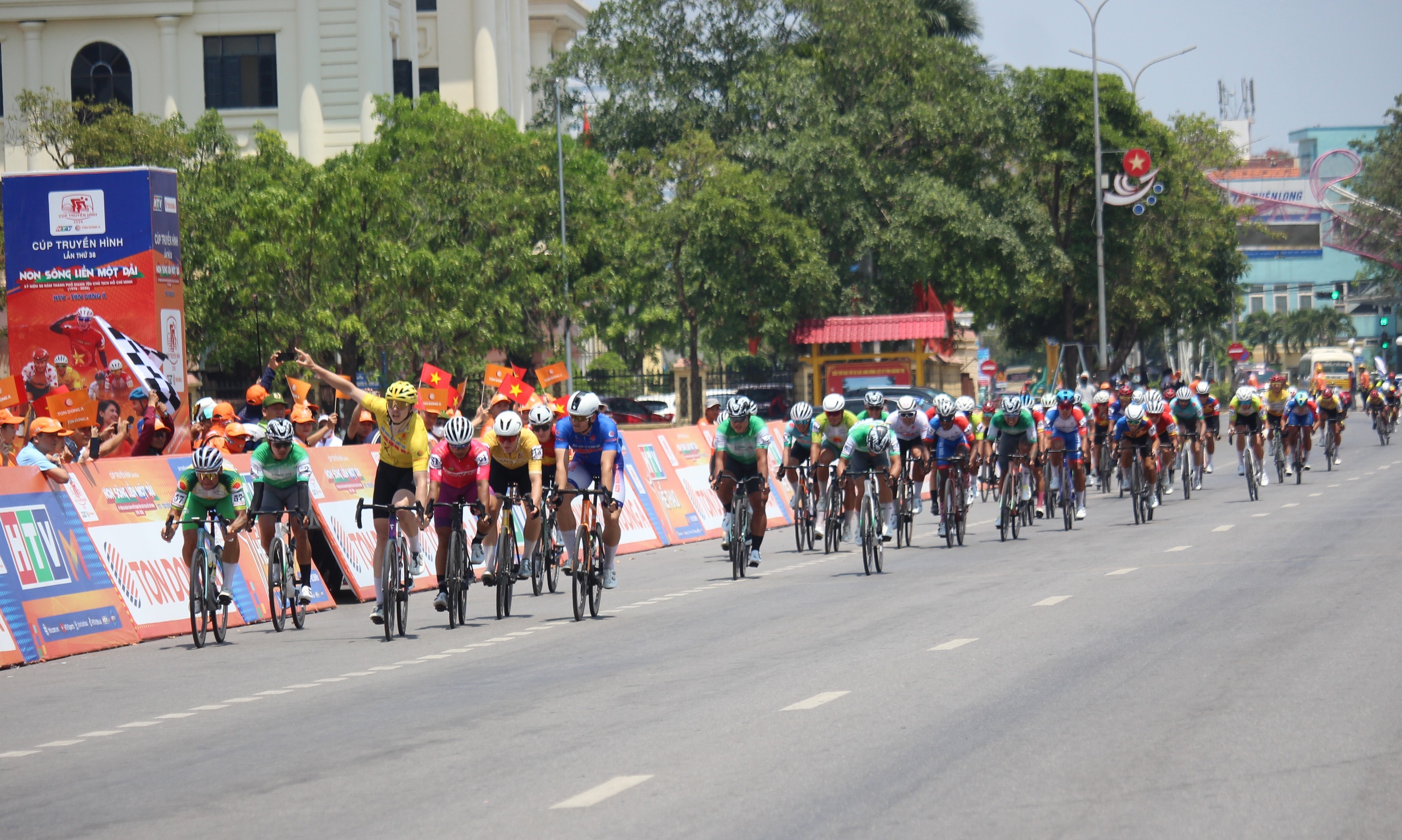 Các tay đua cán đích chặng 7 của cuộc đua xe đạp toàn quốc tranh Cúp Truyền hình TP.HCM lần thứ 38 - 2026 mang tên “Non sông liền một dải” tại Đồng Hới trưa 9/4.