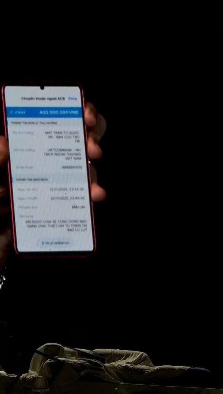 Hiethuhai thông báo anh vừa chuyển khoản 400 triệu đồng ủng hộ đồng bào miền Trung. Khoảnh khắc nam rapper cung cấp thông tin chuyển khoản, khán giả zoom cận màn hình, cho thấy nội dung: “Xin được chia sẻ cùng đồng bào đang chịu thiệt hại từ thiên tai bão lũ”. Nam rapper không ghi tên người gửi, giữ thái độ khiêm tốn.