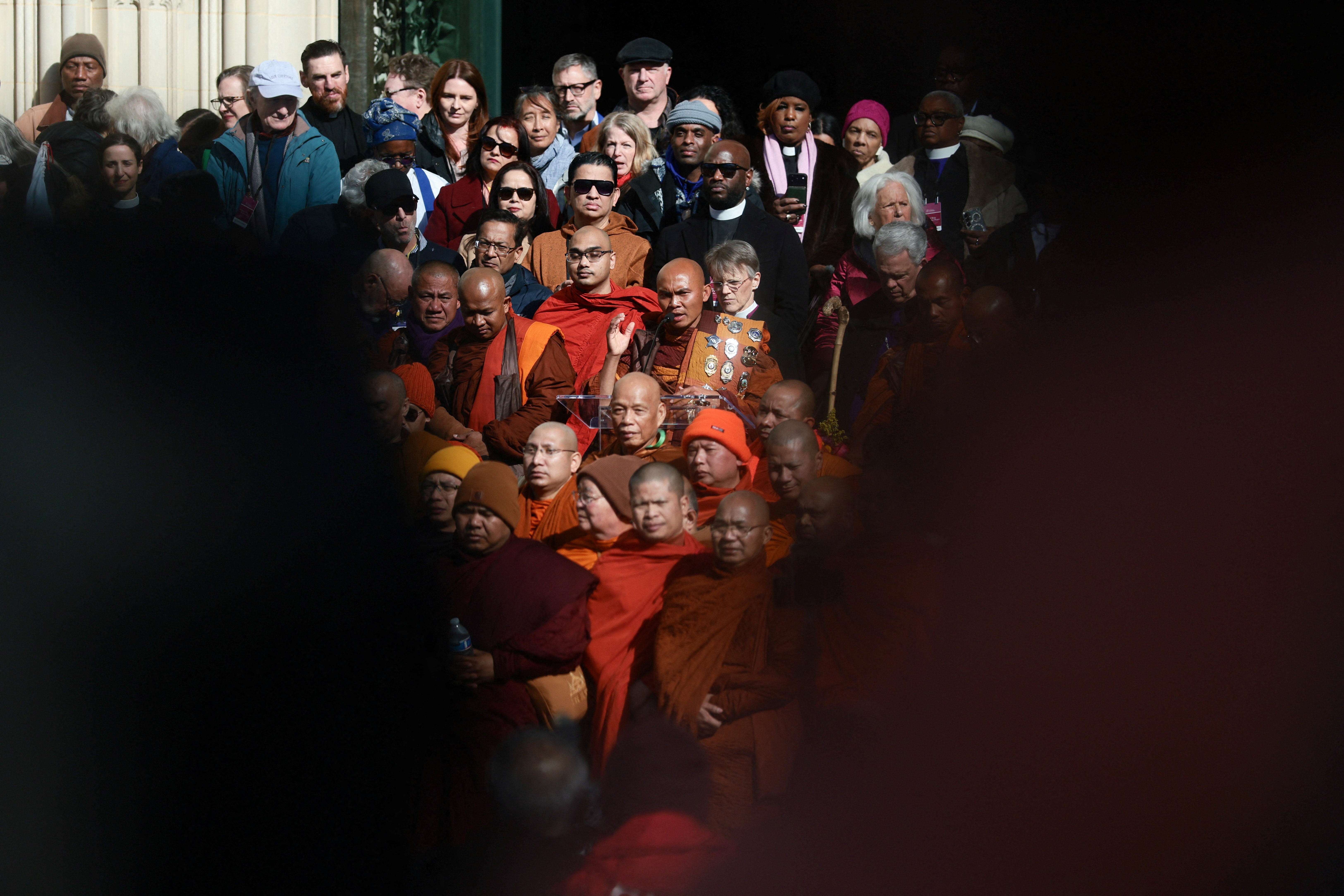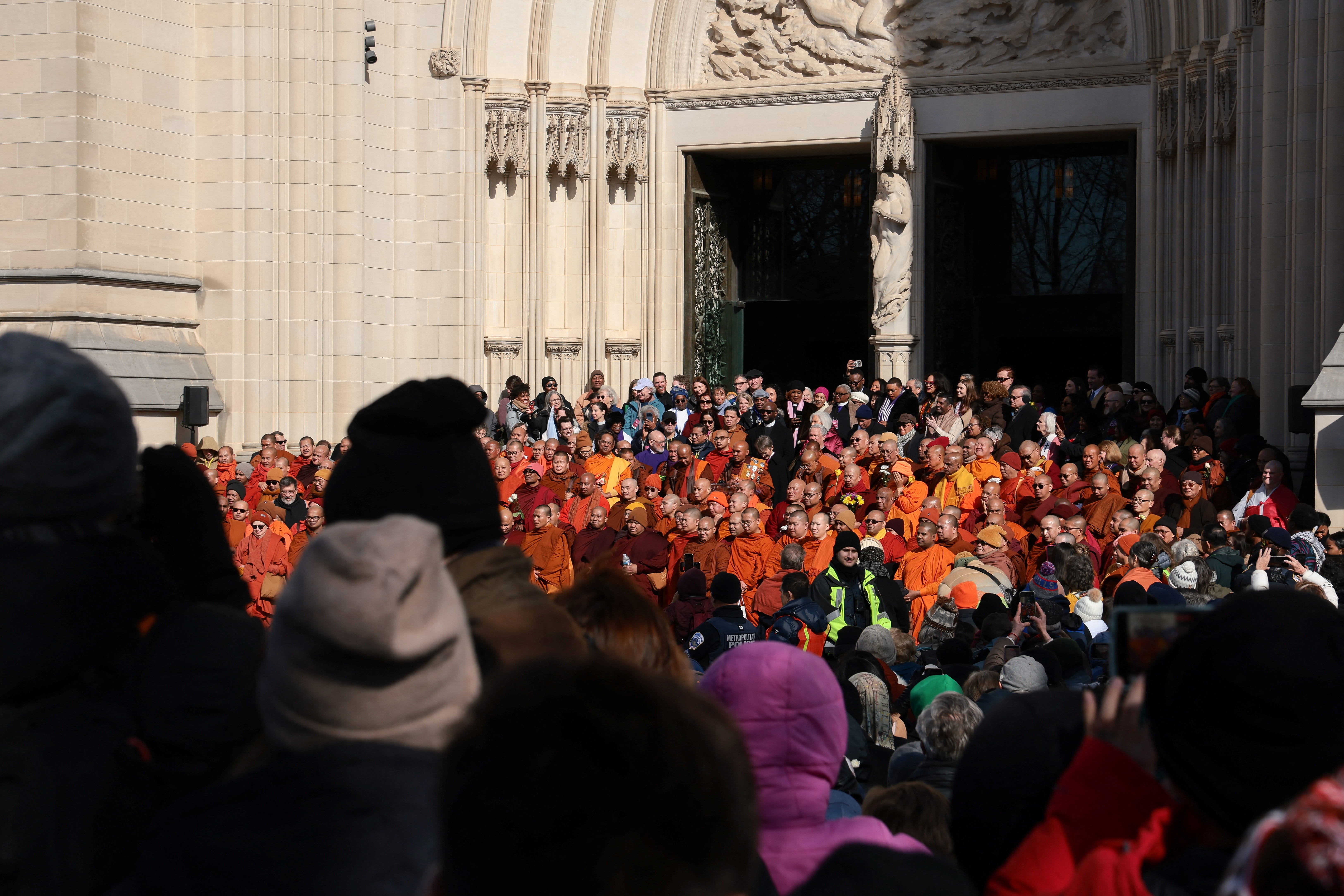 Giám mục Mariann Edgar Budde và Mục sư Randolph Marshall Hollerith đứng hai bên Đại đức Bhikkhu Pannakara khi ông cùng một nhóm nhà sư Phật giáo tham gia hành trình “Bộ hành vì hòa bình” dài 2.300 (3.700 km) dặm bên ngoài Nhà thờ Quốc gia ở Washington D.C. (Mỹ) ngày 10/2.