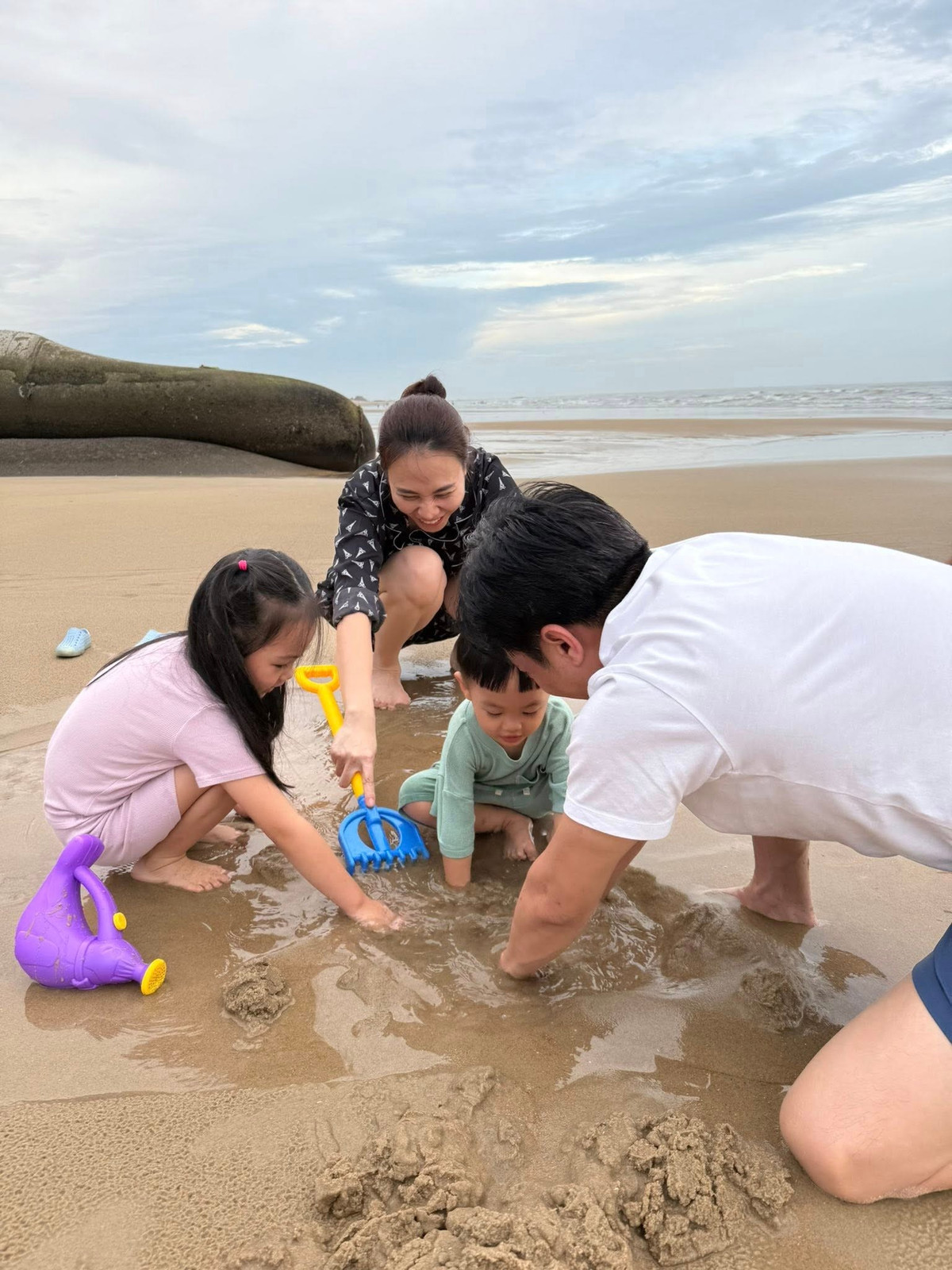 Vợ chồng Cường Đô La chơi đùa cùng các con trên bãi biển. "Một năm trở lại đây tự nhiên mình bận quá trời đất . Hôm qua tranh thủ xong việc chạy xuống chơi với các con được vài tiếng. Giờ ngồi chờ lên máy bay nhìn hình nhớ vợ nhớ con quá đi thôi", nam doanh nhân bày tỏ. Ảnh: FB Cường Đô La.