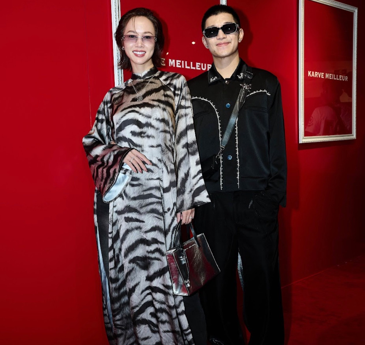 Đến chúc mừng người bạn thân thiết, Vũ Ngọc Anh chọn áo dài họa tiết ấn tượng có tên “Bạch Vân” trong bộ sưu tập “Thanh Uy”. Trong khi đó, Cường Seven mang đến tinh thần hiện đại pha lẫn cá tính với jacket thêu ánh kim cùng quần dáng thụng.
